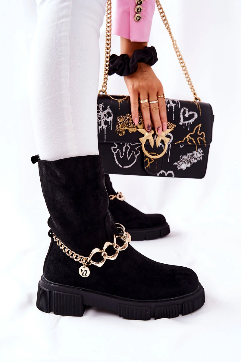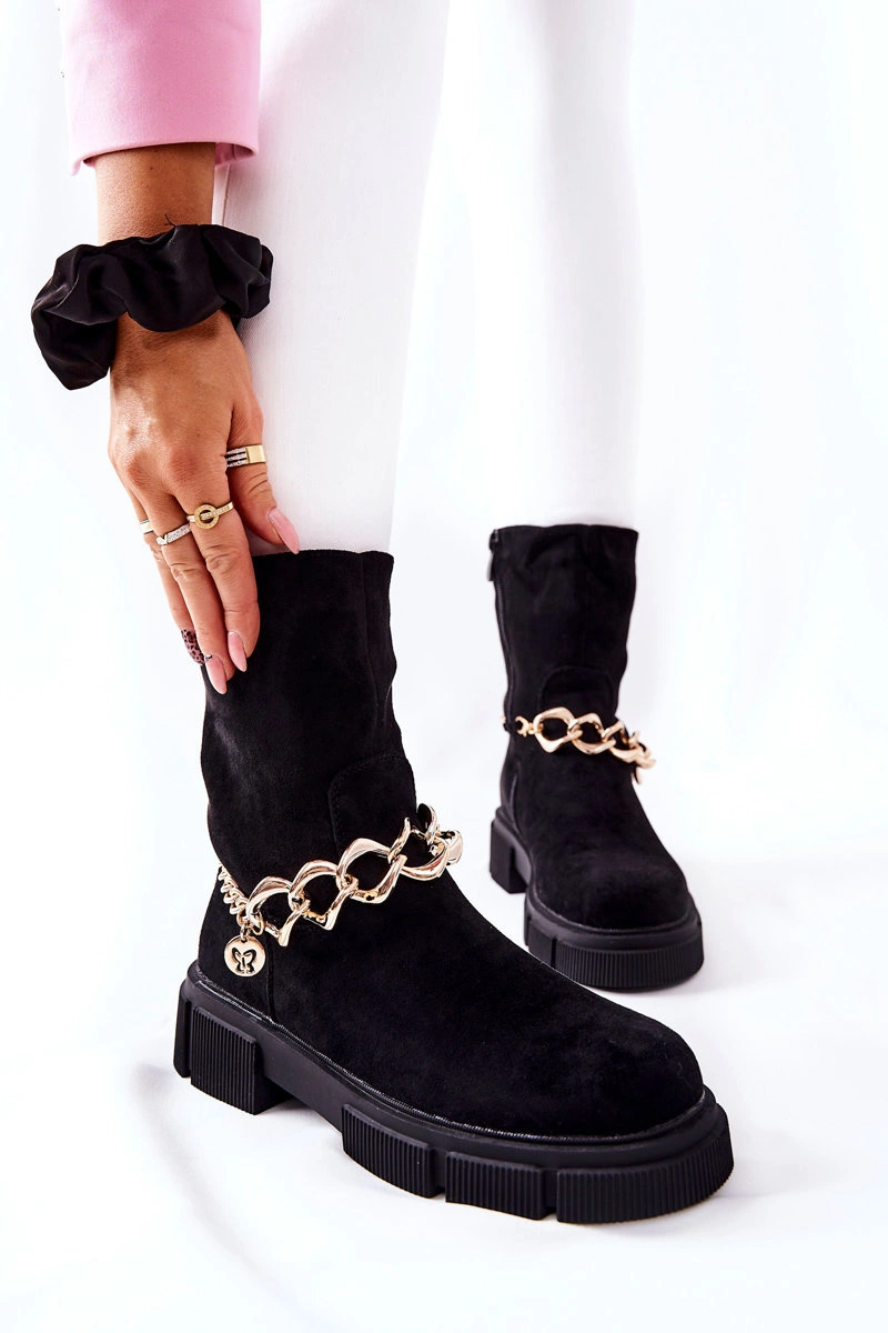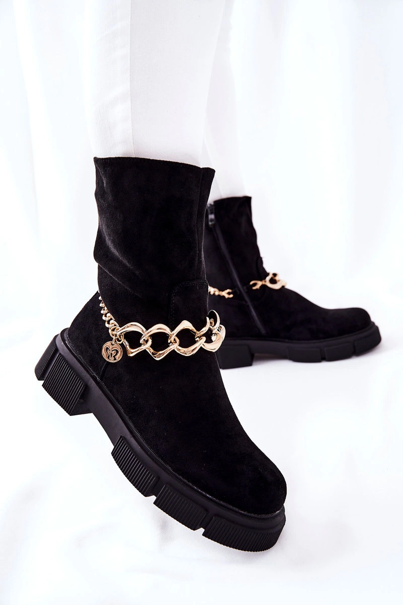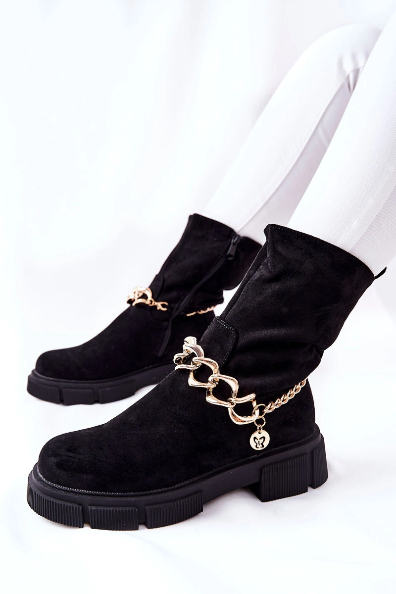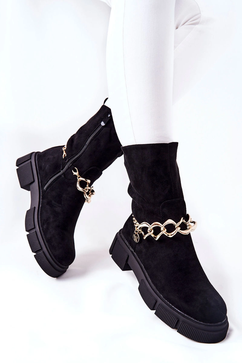 Piękne botki wykonane z eko zamszu będą idealne do wielu stylizacji. Gruba podeszwa sprawia, że botki są stabilne. Ozdobny łańcuch sprawia, że wyglądają bardzo stylowo. Zapinane na suwak. Środek ocieplany delikatnym futerkiem. Nie przegap okazji i kup je już dziś!Przy wyborze rozmiaru prosimy sugerować się tabelą rozmiarów.