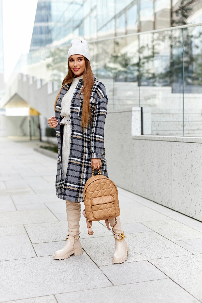Wysokie kozaki za kolano są wykonane z eko skóry. Posiadają pasek na zatrzaski z ozdobnym łańcuchem, który można odpiąć. Kozaki są zapinane na suwak u dołu cholewki. Masywna podeszwa zapewnia stabilność. W środku na wysokości dolnej cholewki posiadają ocieplenie w postaci delikatnego futerka. Przy wyborze rozmiaru prosimy sugerować się tabelą rozmiarów.