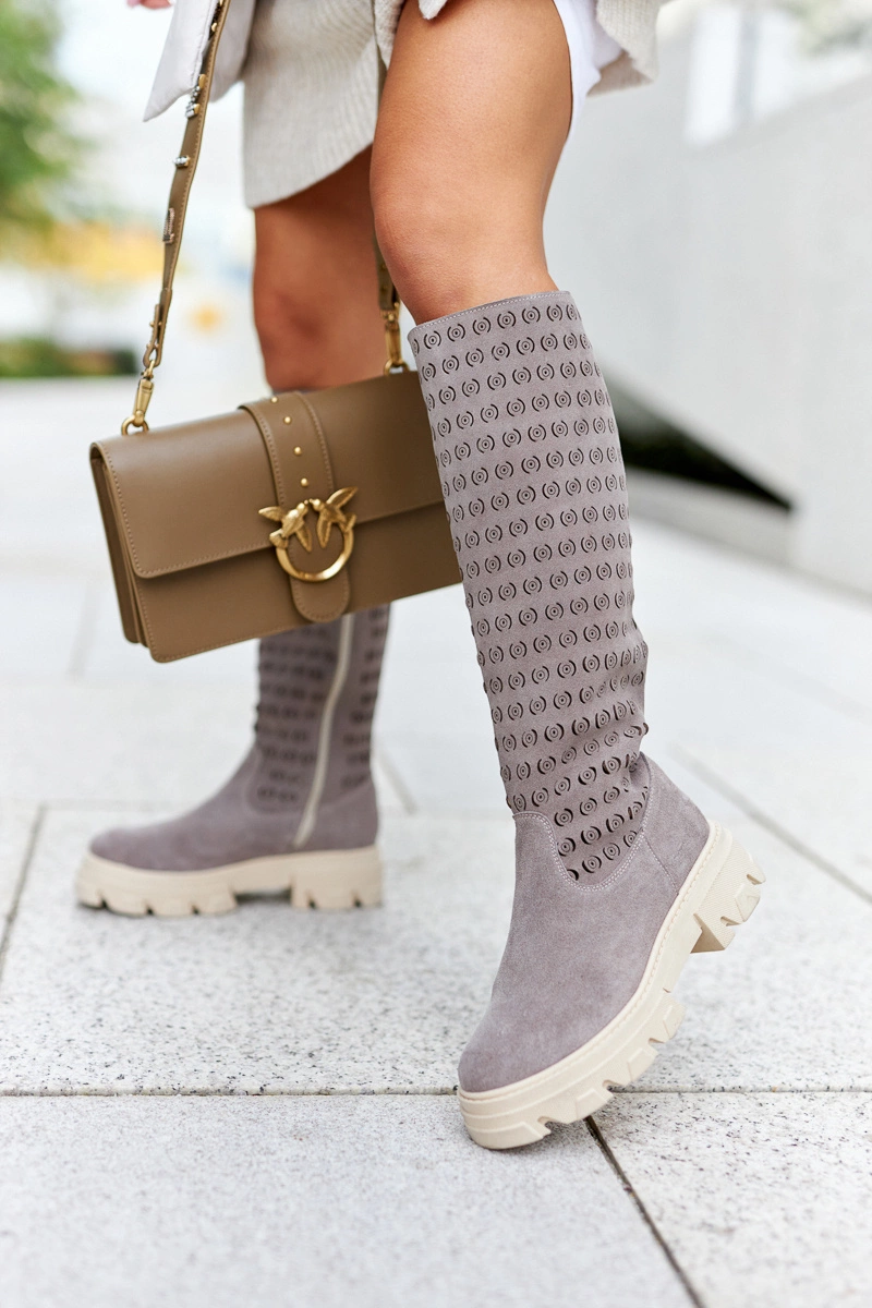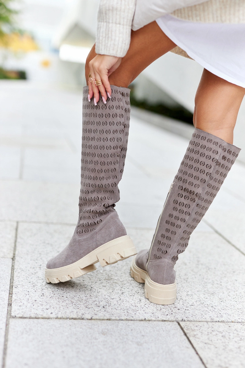 Piękne zamszowe kozaki damskie wykonane zostały ze skóry naturalnej. Na wysokości cholewki występują ażurowe wzorki. Kozaki posiadają grubą, stabilną podeszwę. Suwak ułatwia zakładanie. Idealnie będą się prezentować z sukienkami, jak i dłuższymi spódnicami. Nie czekaj i zakup już dziś! Przy wyborze rozmiaru prosimy sugerować się tabelą rozmiarów.
