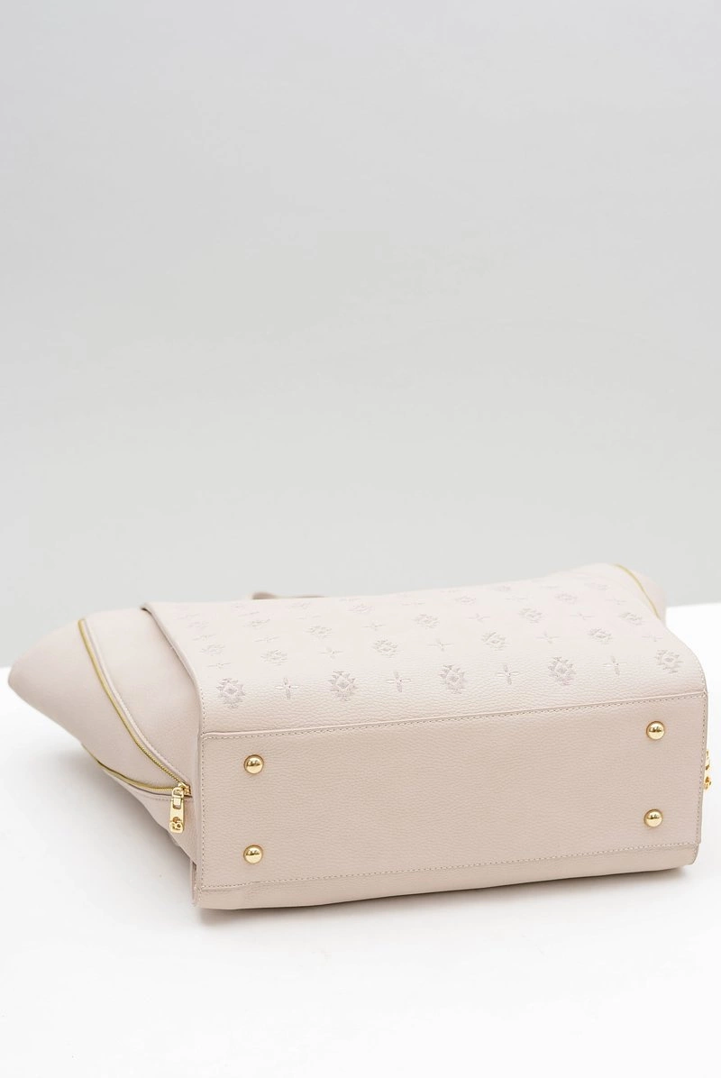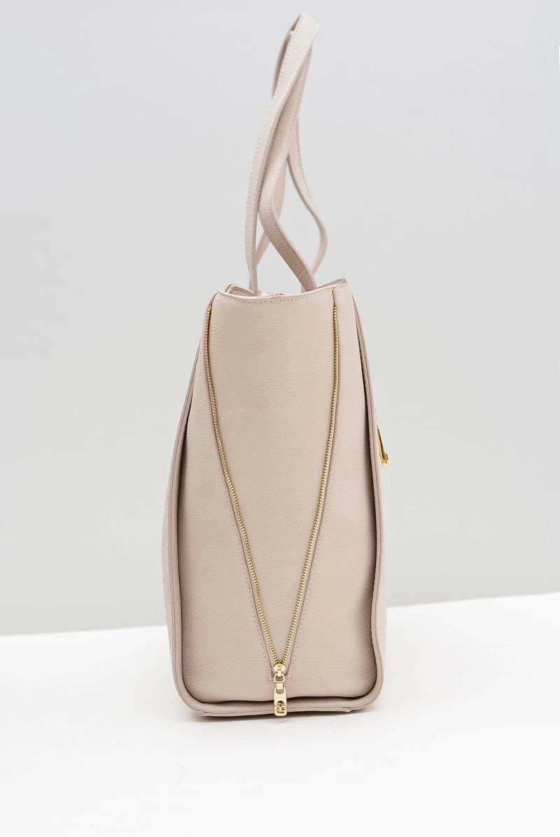 Idealna torebka dla kobiet, które lubią w niej zmieścić dużo rzeczy. Piękny, różowy, skóropodobny materiał zapewnia nienaganną jakość, a złote wstawki w postaci loga oraz zamków dodatkowo ją upiększają. Torebka posiada jedną dużą kieszeń oraz jedną małą z tyłu, każda kieszeń jest zapinana na zamek. Dodatkowo jest możliwość zwężenia boków dzięki regulowanym zamkom, aby zajmowała mniej miejsca.