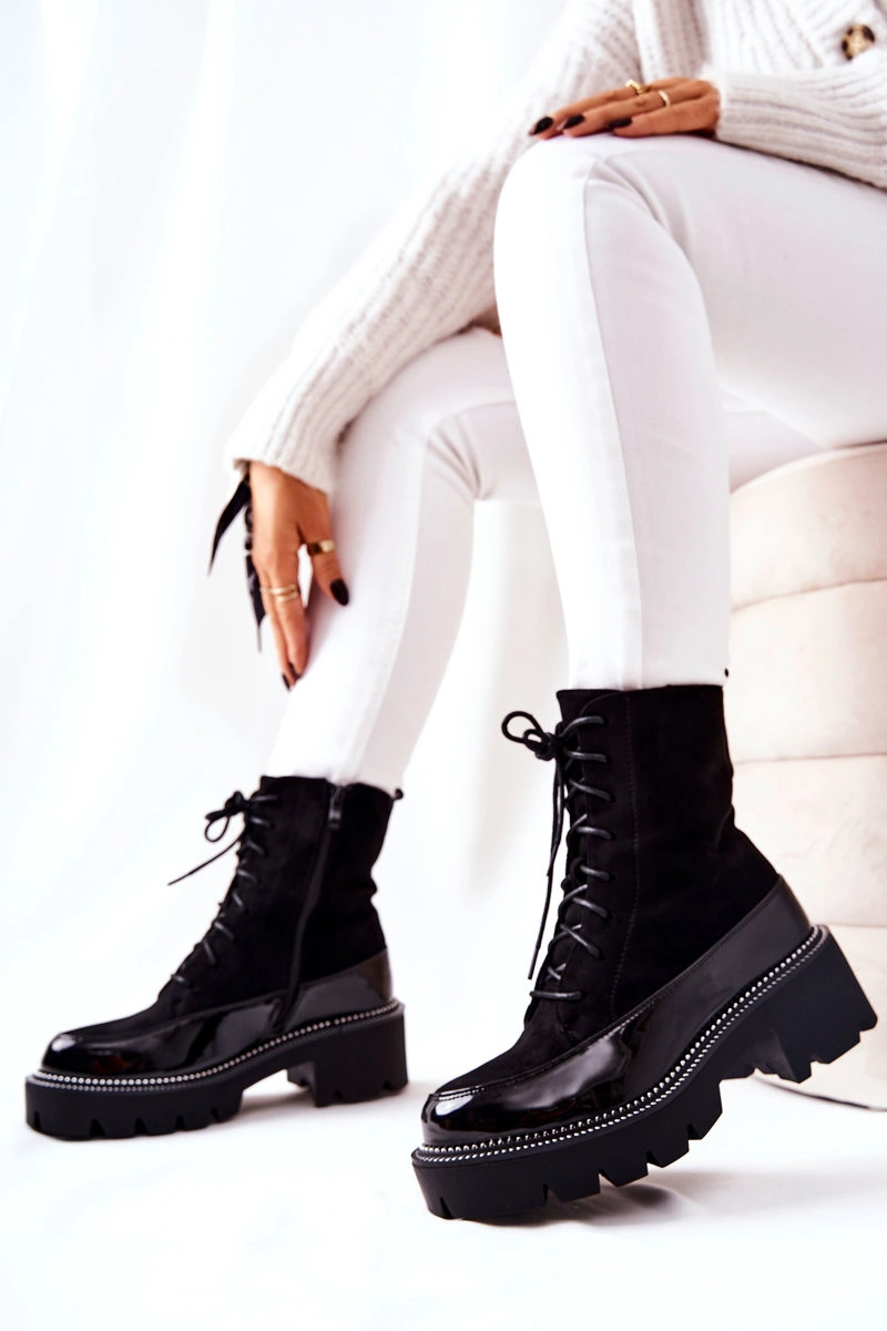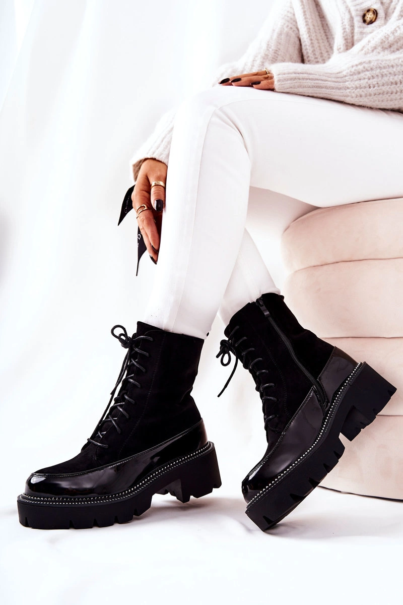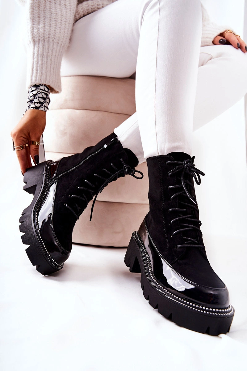 Botki wykonane z zamszowej skóry ekologicznej oraz częściowo lakierowanej. Suwak na boku ułatwi zakładanie. Ocieplane w środku kocem obuwniczym. Posiadają zdobienia przy podeszwie oraz stabilny, płaski obcas.Będziesz w nich wyglądać bardzo stylowo, dlatego nie czekaj i kup już dziś! Przy wyborze rozmiaru prosimy sugerować się tabelą rozmiarów.