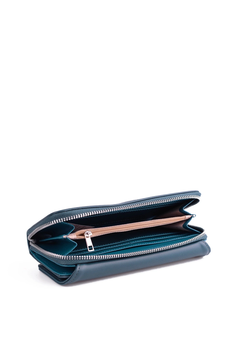Elegancki, duży portfel zapinany na napy oraz na suwak. Wykonany z eko skóry, z metalową wstawką z przodu oraz emblematem. Posiada cztery miejsca na fotografię oraz dużą ilość otwartych kieszonek na wizytówki, dowód osobisty czy karty kredytowe. W komorze zapinanej na suwak znajdują się kolejne otwarte kieszonki oraz miejsce na banknoty. Portfel posiada także kieszeń zapinaną na suwak, w której można przechowywać monety.
