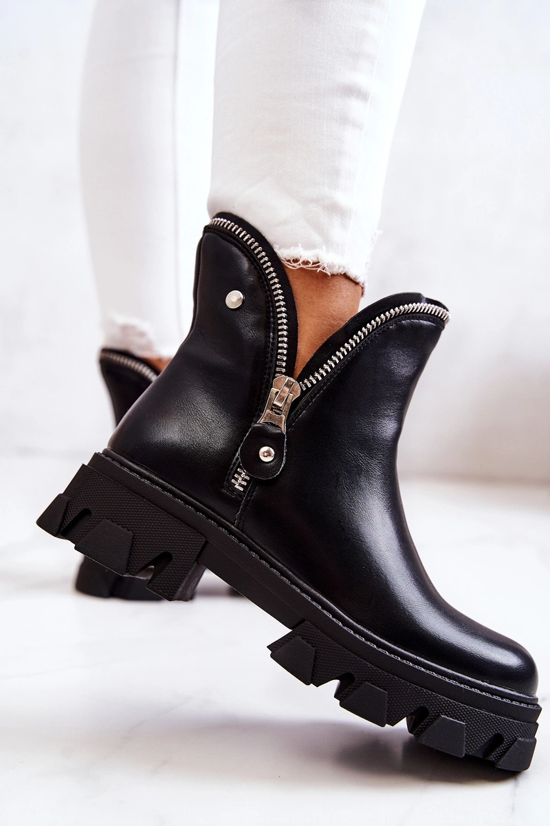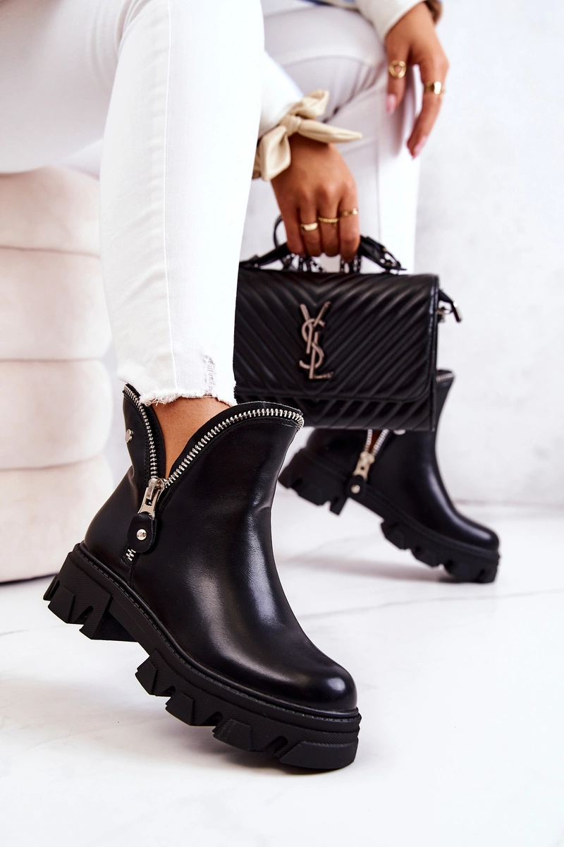 Skórzane Botki Ozdobne Suwaki Czarne Deborah