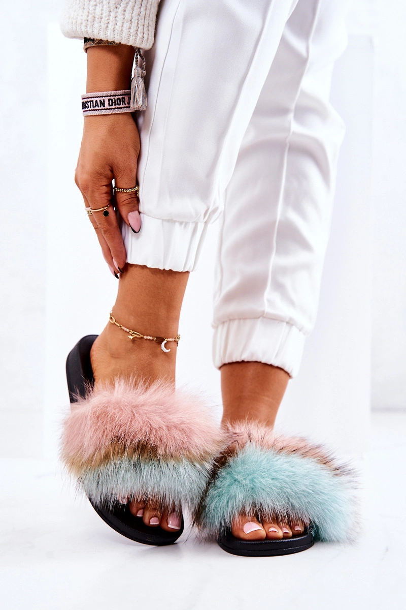 Klapki Z Naturalnym Futerkiem Różowo-Zielone Naturis