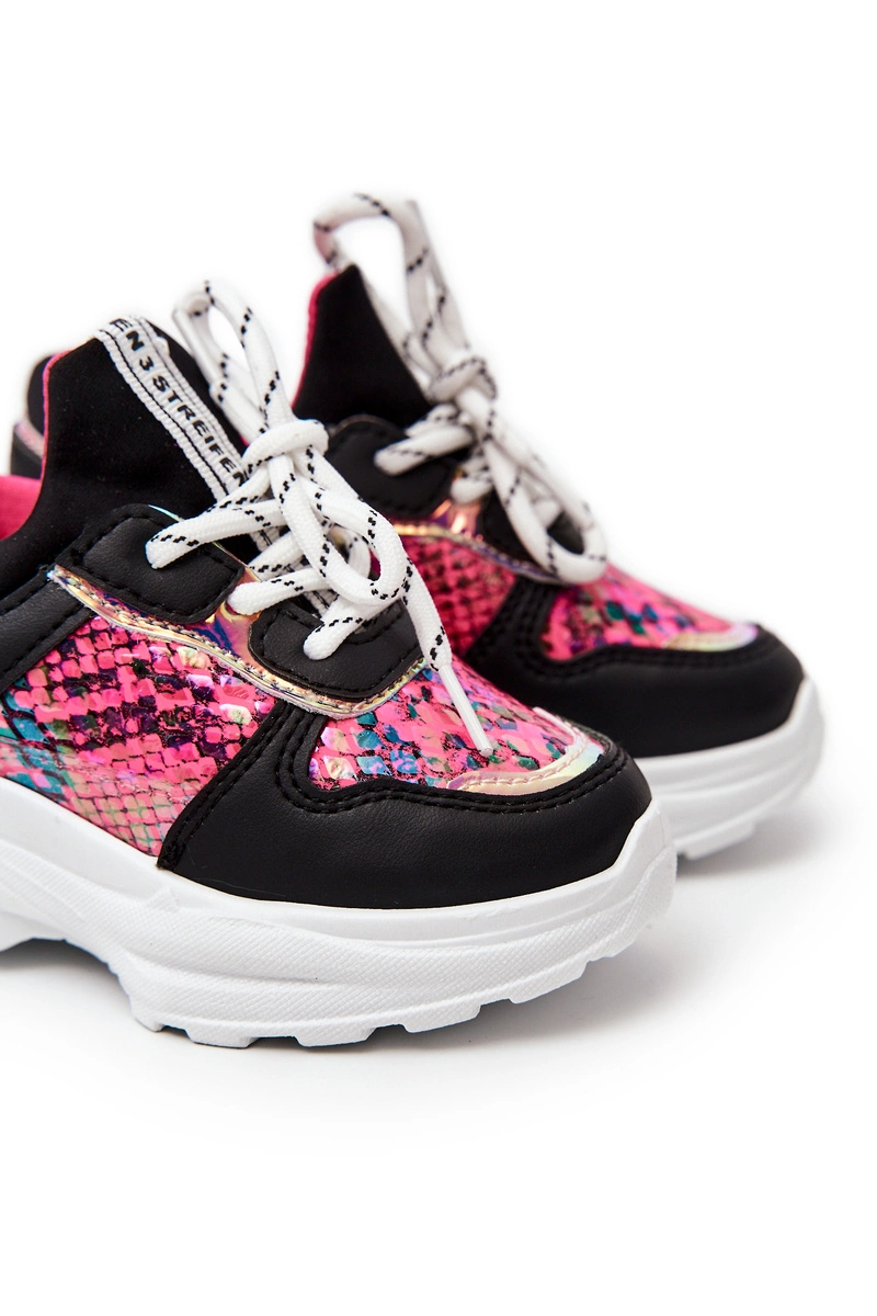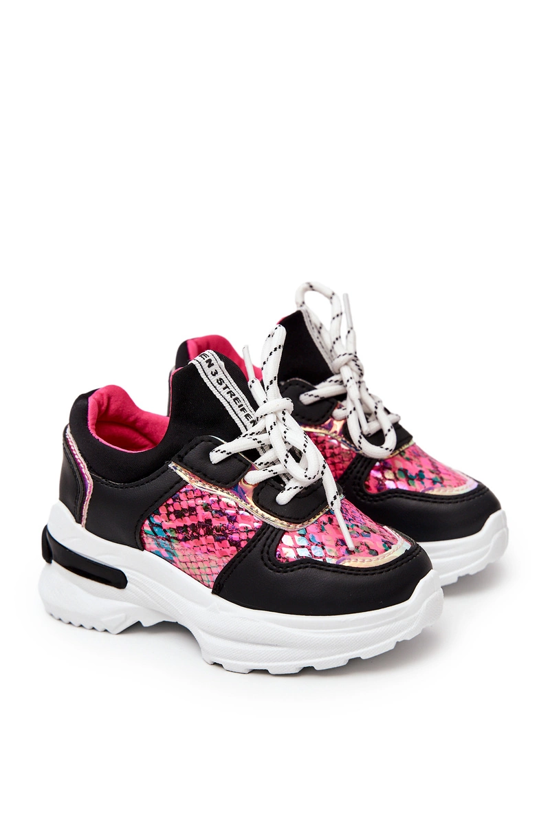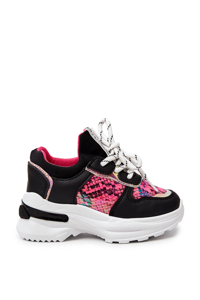Wyjątkowe sportowe buty w wyjątkowy wężowy wzór. Buty wykonane są z eko skóry oraz tkaniny. Posiadają miękką, materiałową wkładkę. Stworzysz z nimi wiele przepięknych stylizacji! Twoja pociecha na pewno będzie zadowolona! Model wiązany. Delikatna platforma świetnie odizoluje od zimnego podłoża. Rozmiary od 19 do 24 posiadają inną podeszwę niż rozmiary od 25 do 30. Przy wyborze rozmiaru prosimy sugerować się tabelą rozmiarów.