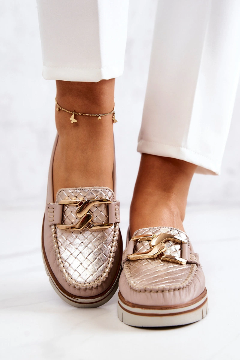 Mokasyny posiadają ozdobę w postaci łańcucha z przodu obuwia. Wyjątkowo kobiece mokasyny na grubszej podeszwie, wykonane z naturalnej skóry. Buciki są lekkie, bardzo wygodne oraz miękkie. Wkładka z naturalnej skóry zapewni wygodę podczas użytkowania. Te buty są idealne na co dzień, świetnie pasują zarówno do casualowych, jak i eleganckich stylizacji. Przy wyborze rozmiaru prosimy sugerować się tabelą rozmiarów.