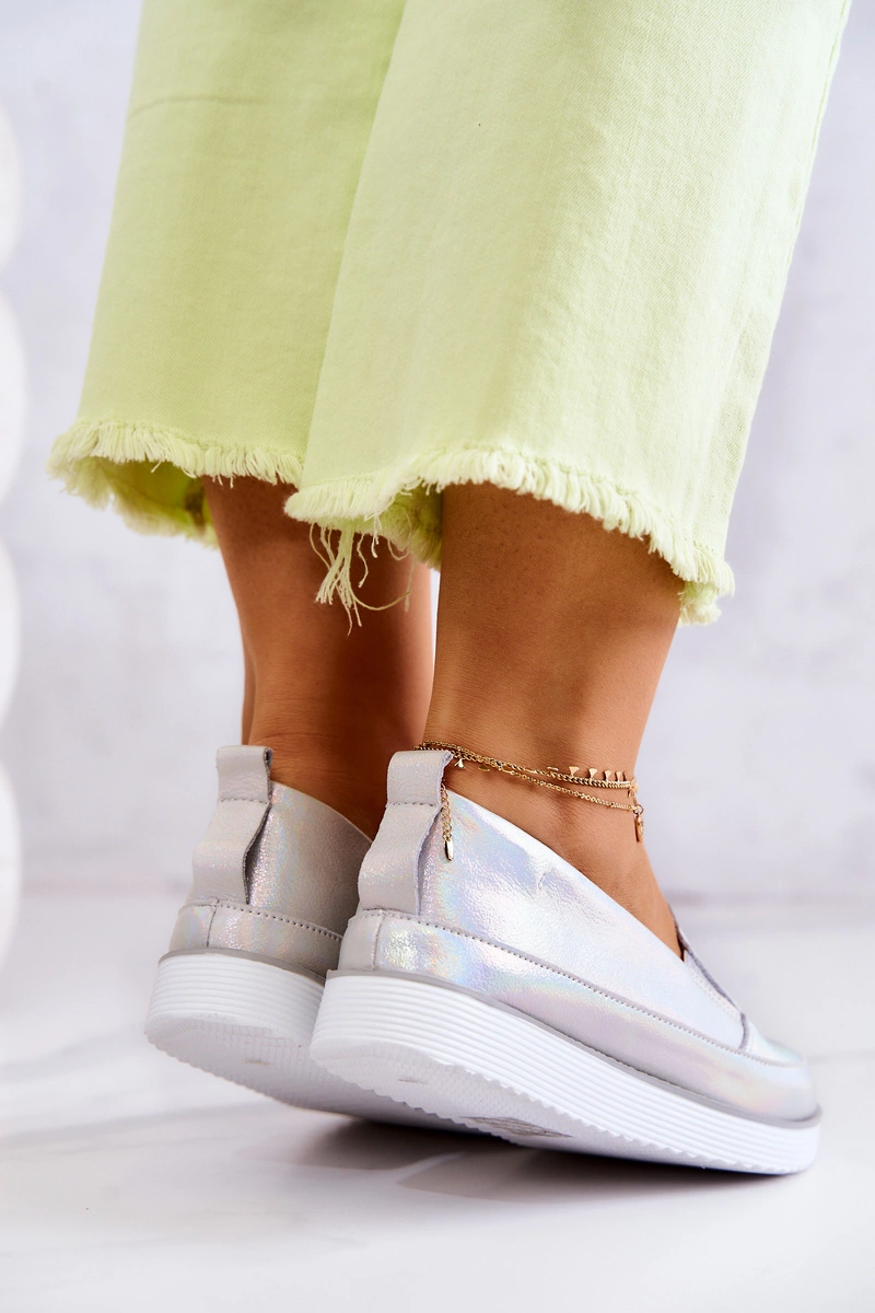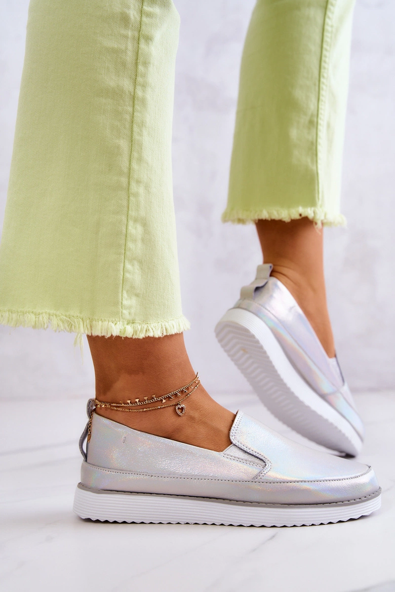 Damskie Skórzane Tenisówki Slip-On S.Barski Holograficzne Srebrne