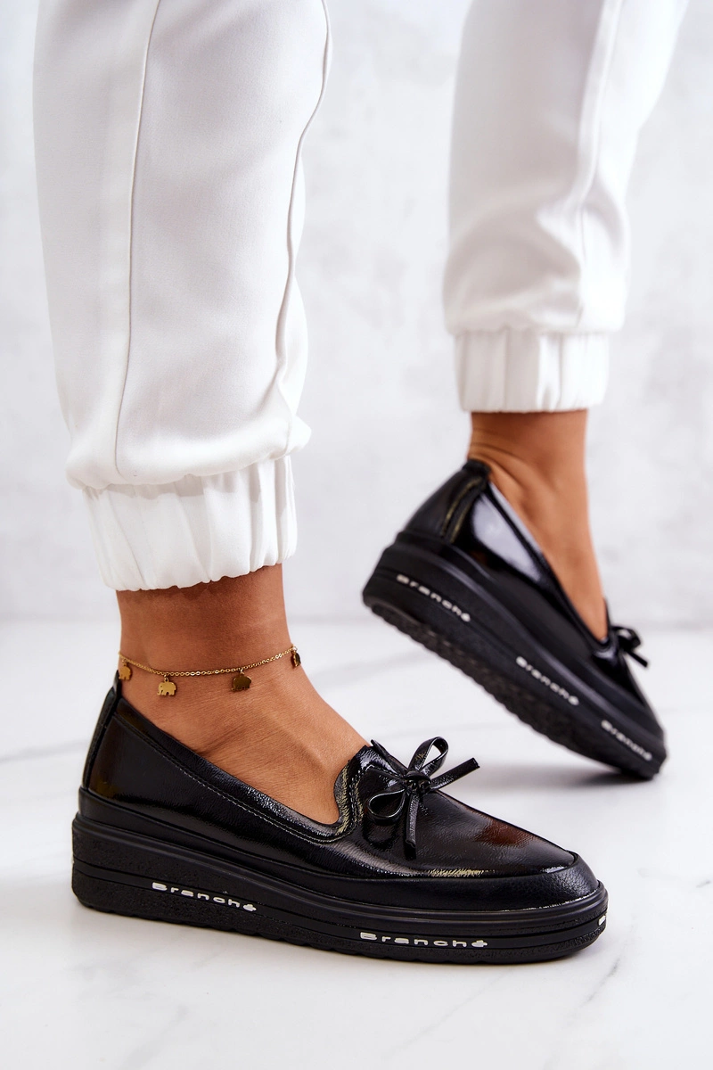 Damskie Lakierowane Mokasyny Na Koturnie Czarne Frilly