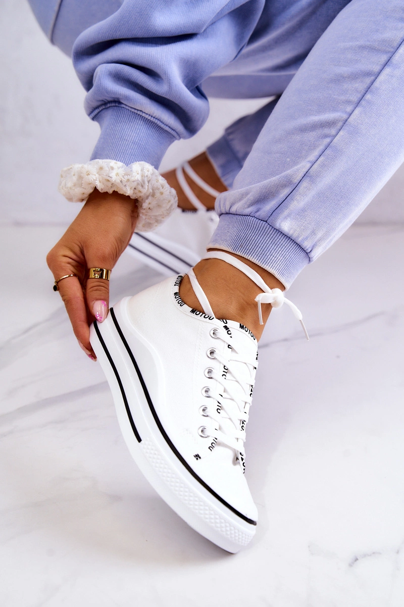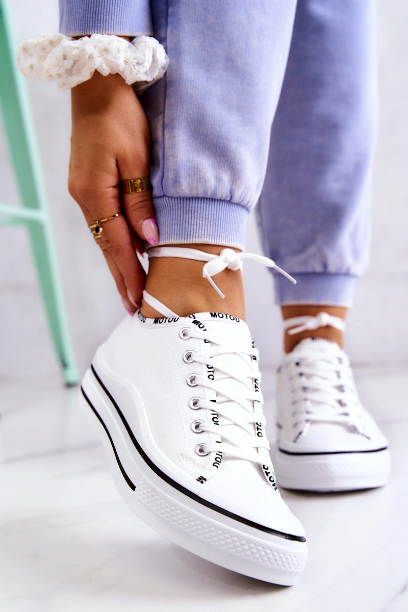 Tenisówki wykonane z materiału tekstylnego. Model wiązani na płaskie sznurowadła. Miękka, materiałowa wkładka wewnątrz. Cholewka do kostki z napisami. Buty posiadają okrągły, wzmocniony gumowym tworzywem nosek. Osadzone na płaskiej podeszwie z delikatnymi żłobieniami, która jest dodatkowo antypoślizgowa. Model idealny zarówno do jeansów, dresów, jak i zwiewnych sukienek. Przy wyborze rozmiaru prosimy sugerować się tabelą rozmiarów.