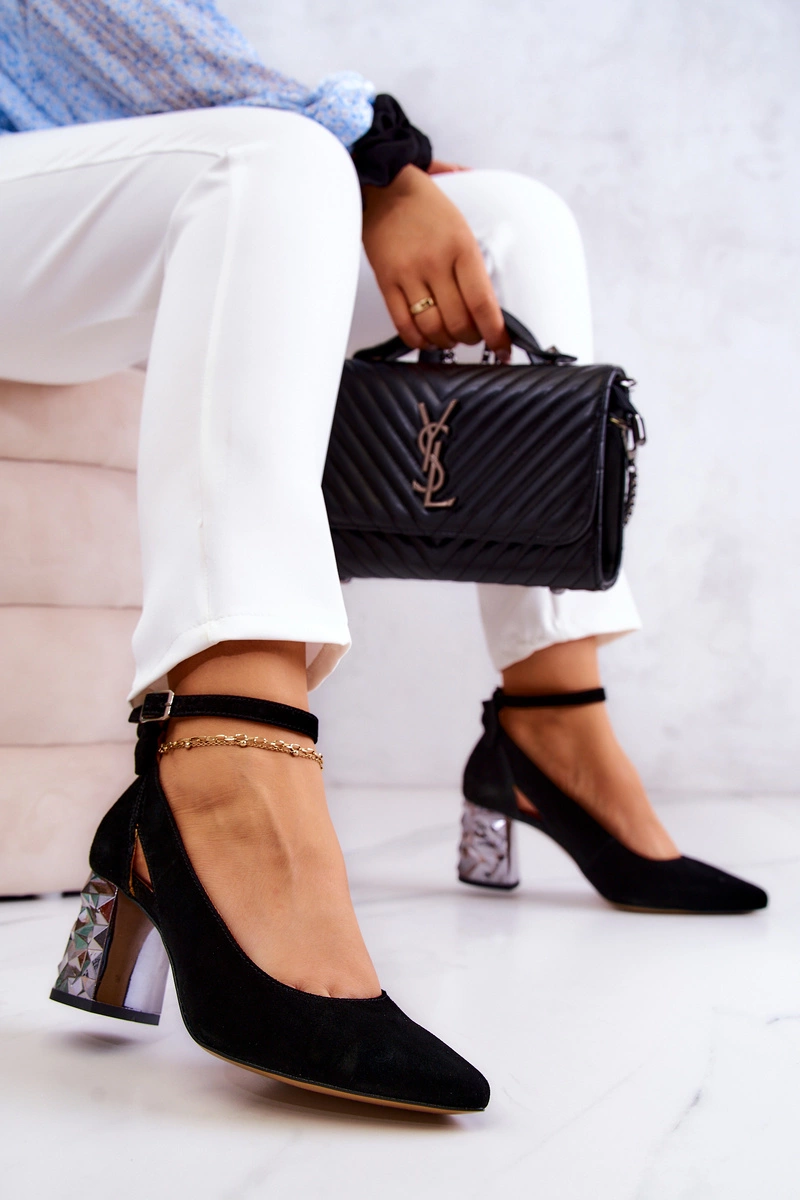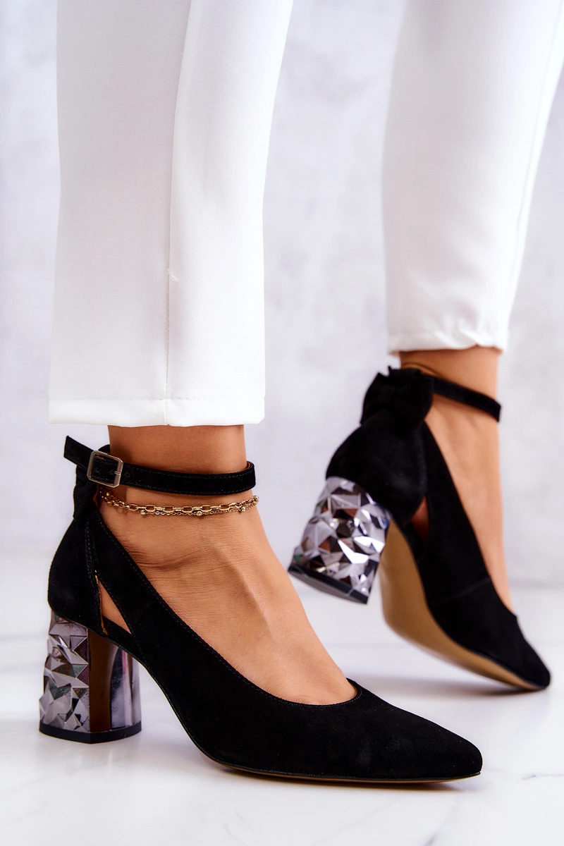 Cholewka została wykonana z przyjemnej w dotyku skóry zamszowej, dzięki której model zyskuje ponadczasowy i elegancki wygląd. Niezwykle wygodne buty na obcasie ze skórzaną wkładką. Ten model jest bardzo komfortowy w noszeniu. Unikatowa ozdoba w stylu kokardki oraz ciekawy wzór obcasa sprawią, że będziesz wyróżniać się z tłumu. Zapinane na regulowany pasek ze sprzączką. Delikatne wycięcia po bokach cholewki. Pięknie prezentują się na nodze! Przy wyborze rozmiaru prosimy sugerować się tabelą rozmiarów.