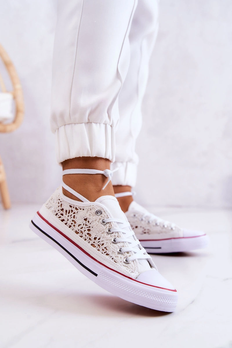 Buty dobrze dopasowują się do kształtu stopy. Posiadają miękką, materiałową wkładkę oraz antypoślizgową podeszwę. Wykonane są z ażurowego materiału tekstylnego. Trampki wiązane na szerokie, płaskie sznurowadła. Okrągły nosek jest wzmacniany gumowym tworzywem. Przewiewny model, idealny na sezon wiosenno-letni. Możesz łączyć je z jeansami, zwiewną spódnicą czy szortami! Uwaga! Wzór gumy na przodzie platformy może się różnić w zależności od dostawy! Przy wyborze rozmiaru prosimy sugerować się tabelą rozmiarów.