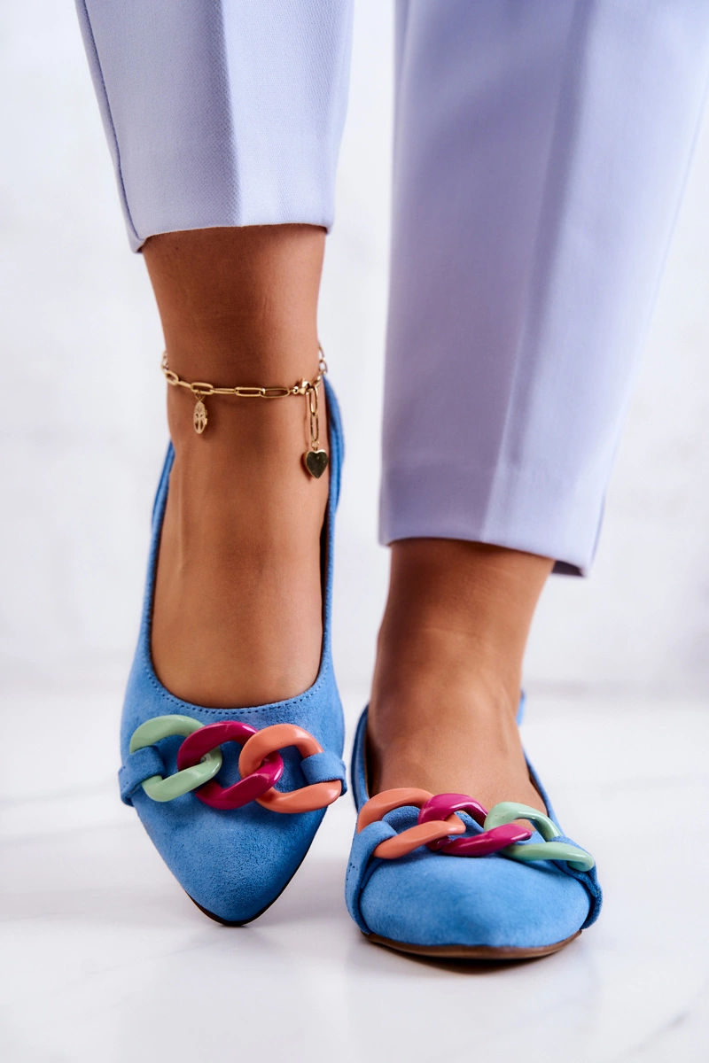 Cudowne baleriny wykonane z naturalnego zamszu. Posiadają nosek w szpic. Na przodzie znajduje się łańcuch z tworzywa sztucznego, co sprawia, że przykuwają uwagę swoim wyglądem. Cienki pasek przy kostce jest regulowany oraz zapinany na sprzączkę. Baleriny osadzono na płaskim obcasie. Wkładka wykonana z naturalnej skóry jest miękka i wygodna w użytkowaniu. Świetny model dla osób ceniących sobie komfort oraz uniwersalność. Przy wyborze rozmiaru prosimy sugerować się tabelą rozmiarów.