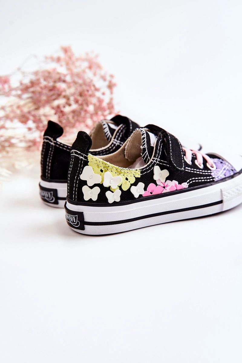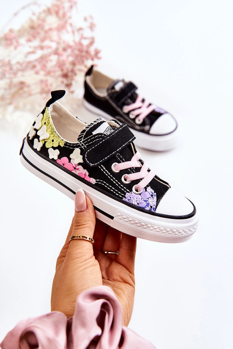 Klasyczne trampki dziecięce zapinane na rzep. Wykonane z materiału tekstylnego z gumowym wzmocnieniem na nosku. Piękny print oraz przyszyte motylki na boku cholewki sprawiają, że te buciki wyglądają naprawdę cudownie. Dodatkowo buty posiadają gumki imitujące sznurówki. Miękka wkładka wykonana z tkaniny jest wyciągana i profilowana. Podeszwa wykonana z gumowego tworzywa, antypoślizgowa. Z tyłu obuwia znajduje się pętelka ułatwiająca zakładanie i ściąganie obuwia. Trampki mają delikatnie usztywniany zapiętek. Przy wyborze rozmiaru prosimy sugerować się tabelą rozmiarów.