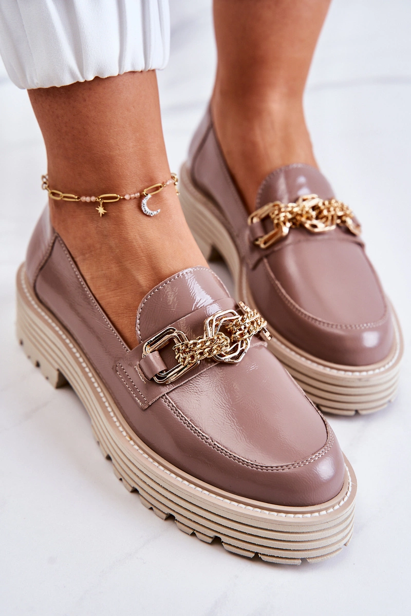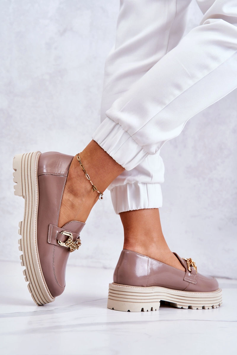 Klasyczne półbuty w stylu przepięknych loaferów! Buty zostały wykonane z wysokiej jakości skóry naturalnej. Charakterystyczne zdobienie w postaci łańcucha sprawi, że stworzymy z nimi wiele wspaniałych stylizacji. Posiadają wysoką podeszwę obszytą nicią oraz płaski obcas, który uniesie sylwetkę. Świetny model do wielu stylizacji! Wygodne, a zarazem modne. Koniecznie musisz je mieć! Przy wyborze rozmiaru prosimy sugerować się tabelą rozmiarów.