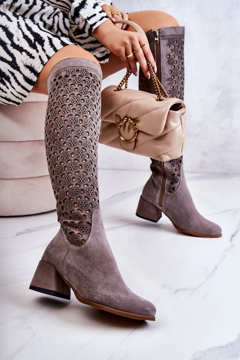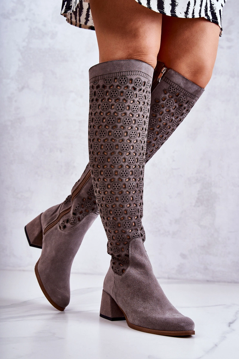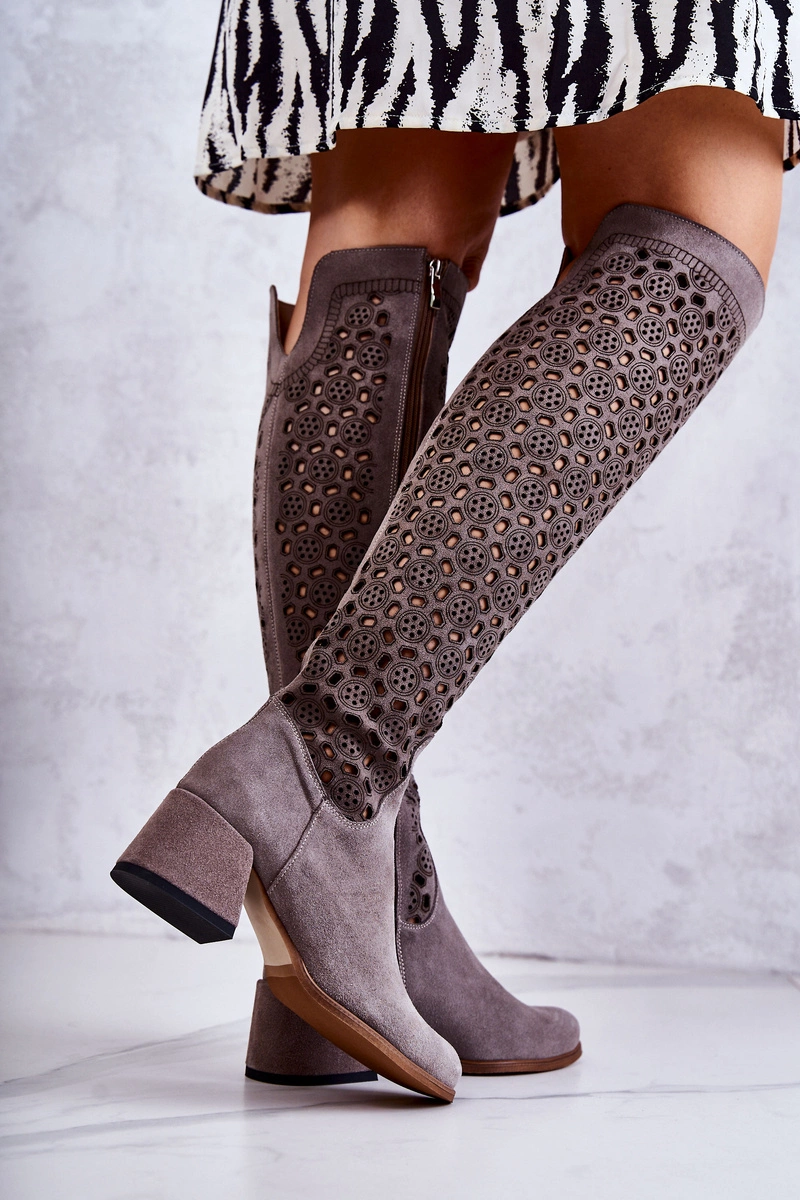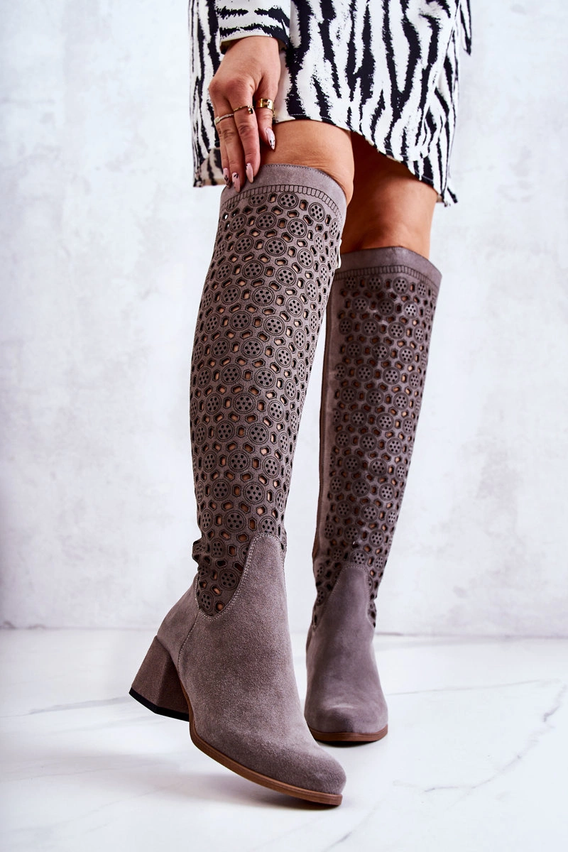 Zamszowe Kozaki Z Ażurowym Wzorem Szare Hekilea