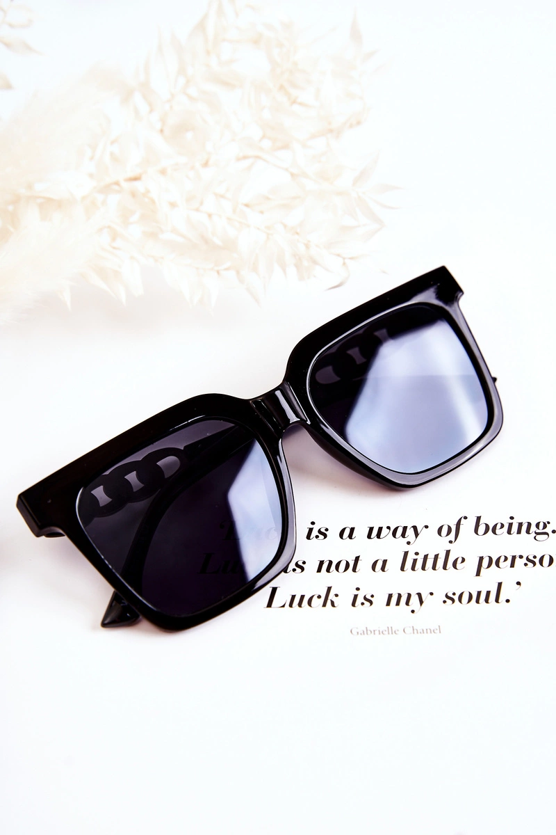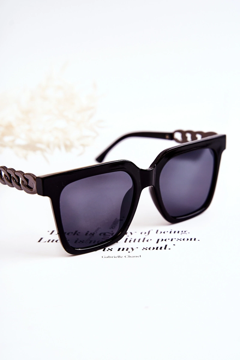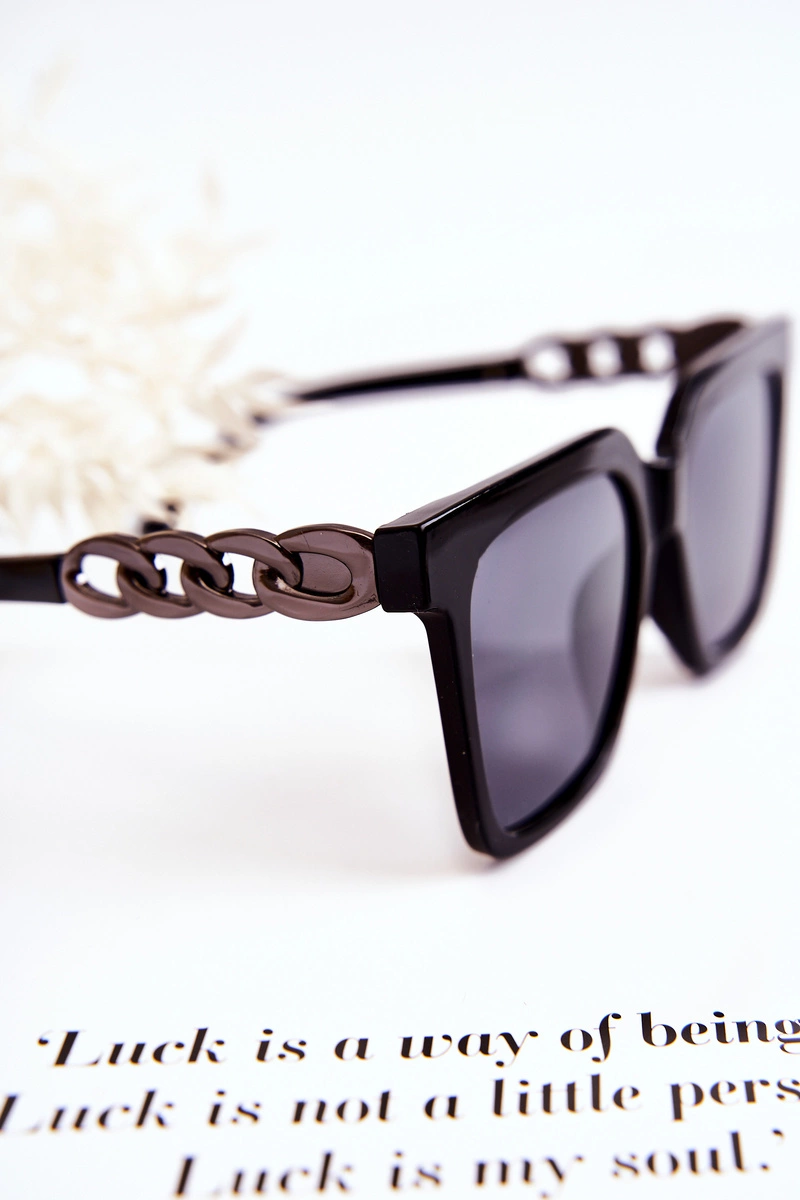 Modne okulary przeciwsłoneczne świetnie sprawdzą się w wielu sytuacjach! Nie tylko podczas letniego sezonu, ale także zimowego, kiedy promienie słoneczne odbijają się od śniegu. Model kwadratowy. Posiada cienkie oprawki soczewek u dołu i po bokach, grubsze u góry. Mostek z tworzywa sztucznego. Zauszniki wykonane z tworzywa sztucznego z ozdobnym dodatkiem w postaci łańcucha. Informacja od producenta: okulary absorbują szkodliwe promienie UV, kategoria 3.