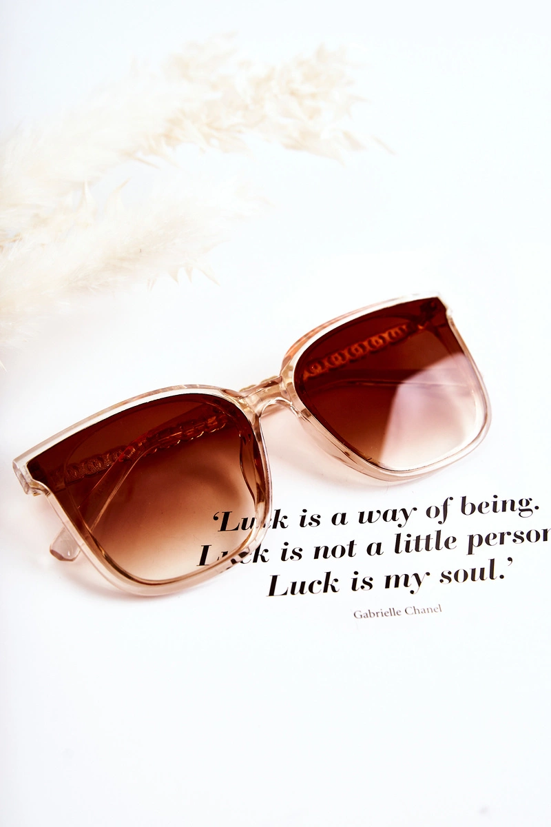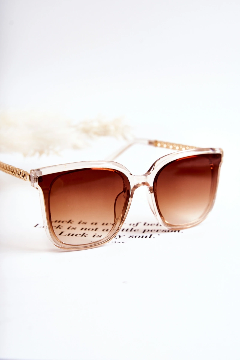 Wyjątkowe i stylowe okulary przeciwsłoneczne świetnie sprawdzą się w wielu sytuacjach! Nie tylko podczas letniego sezonu, ale także zimowego, kiedy promienie słoneczne odbijają się od śniegu. Model ten został wykonany z tworzywa sztucznego. Złota ozdoba w postaci przeplatających się kółek zdobi zauszniki. Informacja od producenta: okulary absorbują szkodliwe promienie UV, kategoria 2.