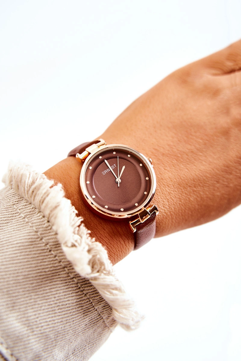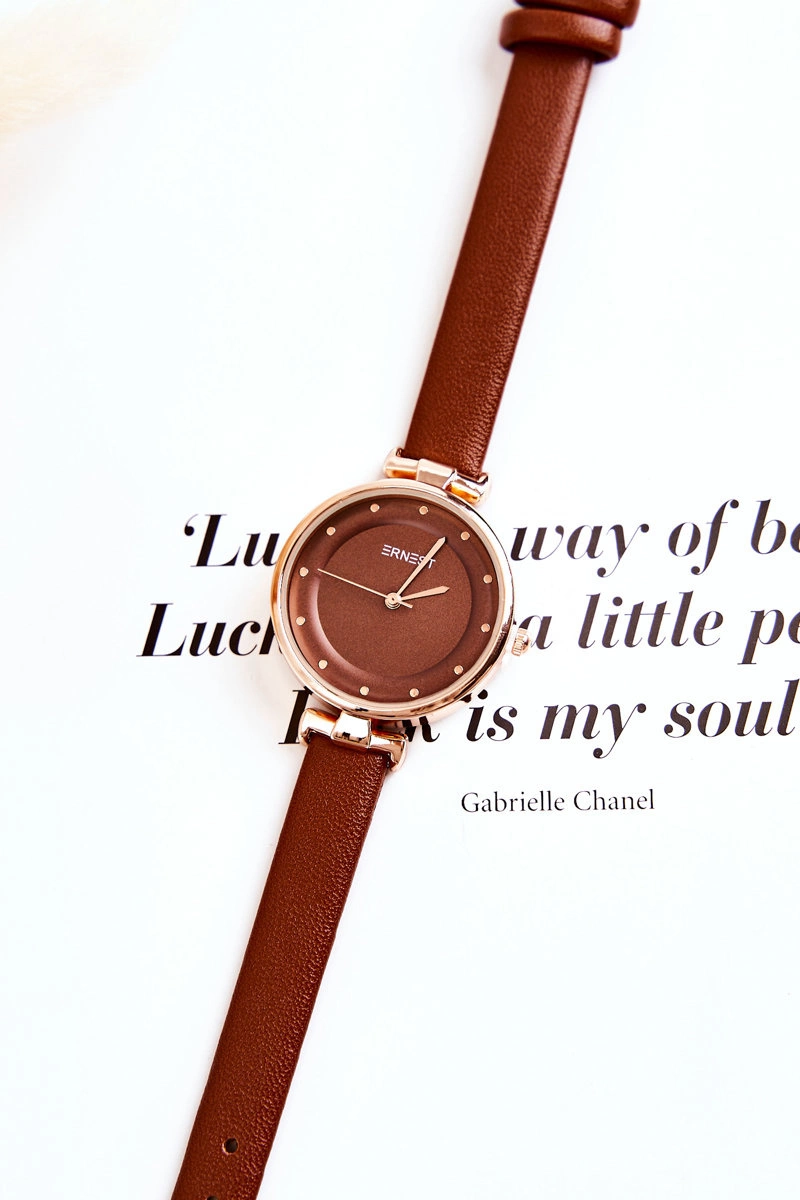 Damski zegarek Ernest to model dla każdej kobiety uwielbiającej modne dodatki! Zegarek idealny na co dzień. Posiada regulowany pasek ze skóry ekologicznej. Zapinany na sprzączkę. Tarcza w odcieniu paska zegarka. Wykonany z nierdzewnej stali. Nie zawiera niklu. Koniecznie powinnaś go mieć!