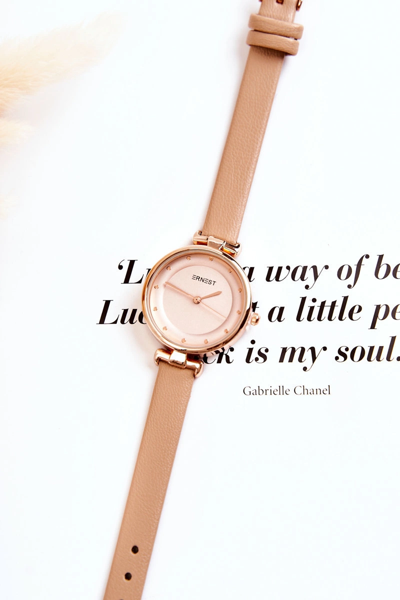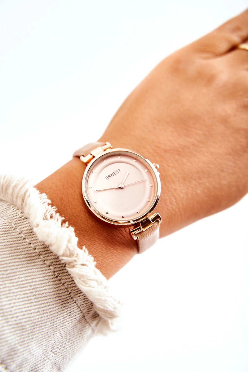 Damski zegarek Ernest to model dla każdej kobiety uwielbiającej modne dodatki! Zegarek idealny na co dzień. Posiada regulowany pasek ze skóry ekologicznej. Zapinany na sprzączkę. Tarcza w odcieniu paska zegarka. Wykonany z nierdzewnej stali. Nie zawiera niklu. Koniecznie powinnaś go mieć!