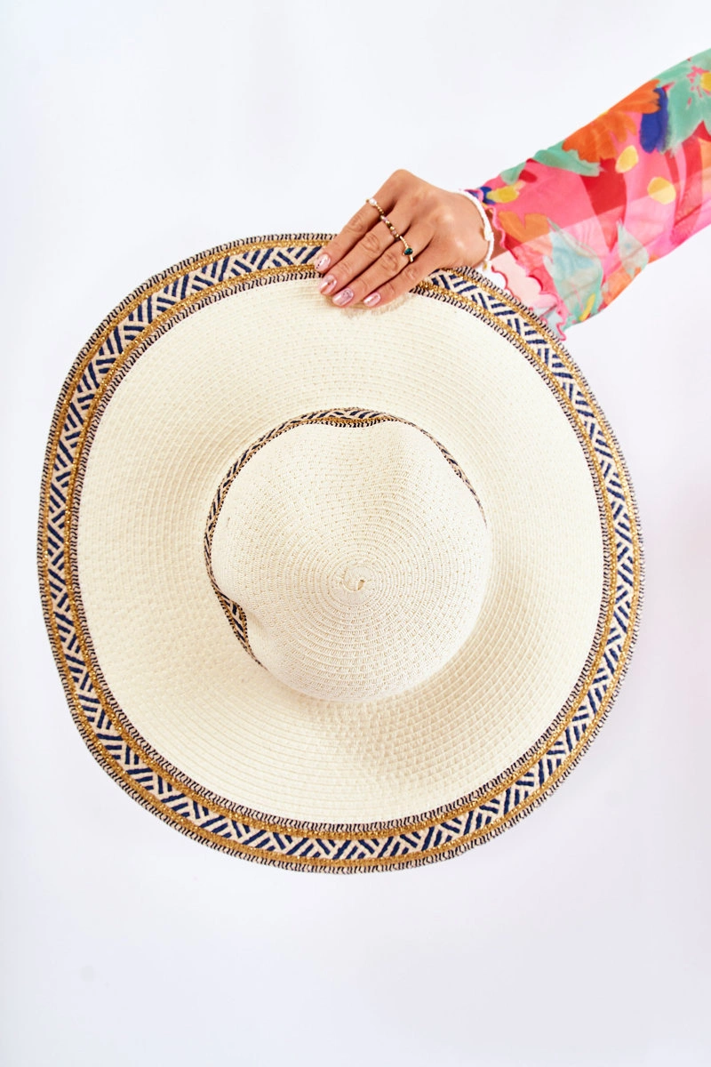 Damski kapelusz idealny na słoneczne dni. Kapelusz na koronie oraz rondzie posiada piękne, ozdobne paski z pozłacaną nicią. Produkt wykonany jest w 100 % z papieru. Produkt posiada sznureczek dzięki, któremu można idealnie dopasować kapelusz. Koniecznie sprawdź całą naszą kolekcję kapeluszy!