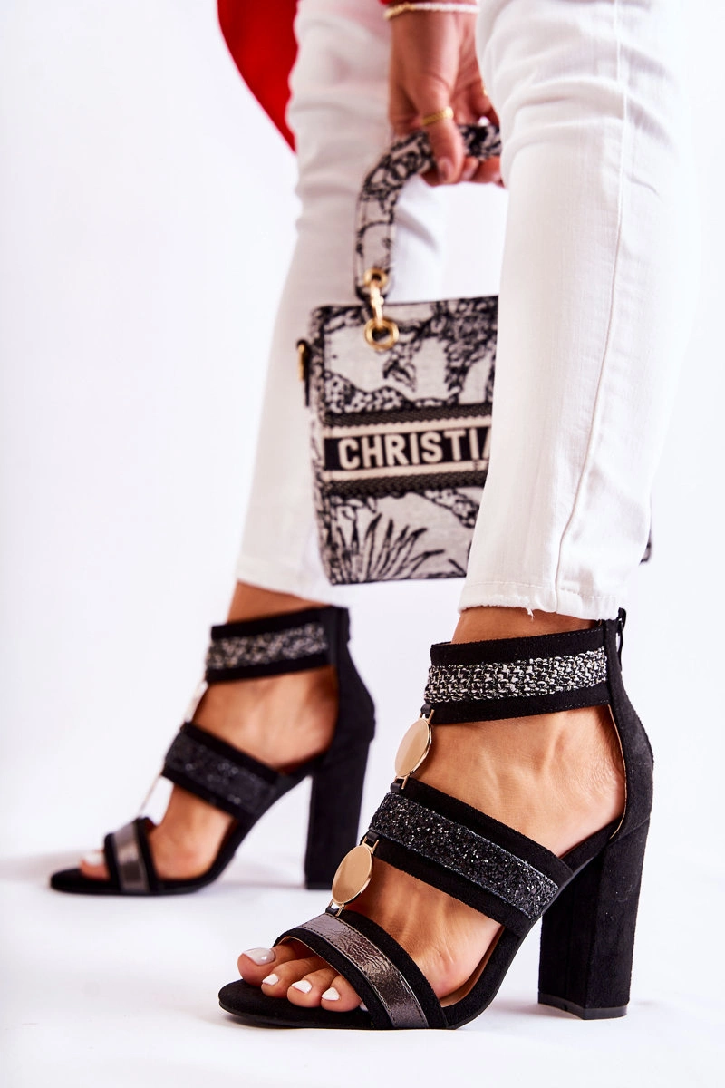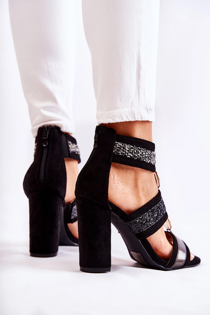 Wygodne damskie sandałki na wysokim obcasie. Wykonane z eko zamszu ze wstawkami z tkaniny. Sandałki z trzema ozdobnymi paskami. Z tyłu cholewki zapinane na zamek. Dobrze wyprofilowana wkładka z eko skóry. Buty wygodne, świetnie sprawdzą się podczas różnego rodzaju uroczystości lub randki. Posiadają odkryty, zaokrąglony nosek. Przy wyborze rozmiaru prosimy kierować się tabelą rozmiarów.