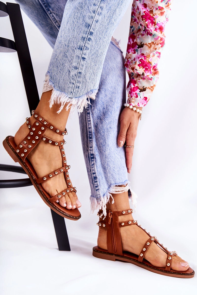 Damskie Sandały Na Suwak Z Ćwiekami Brązowe Cavos