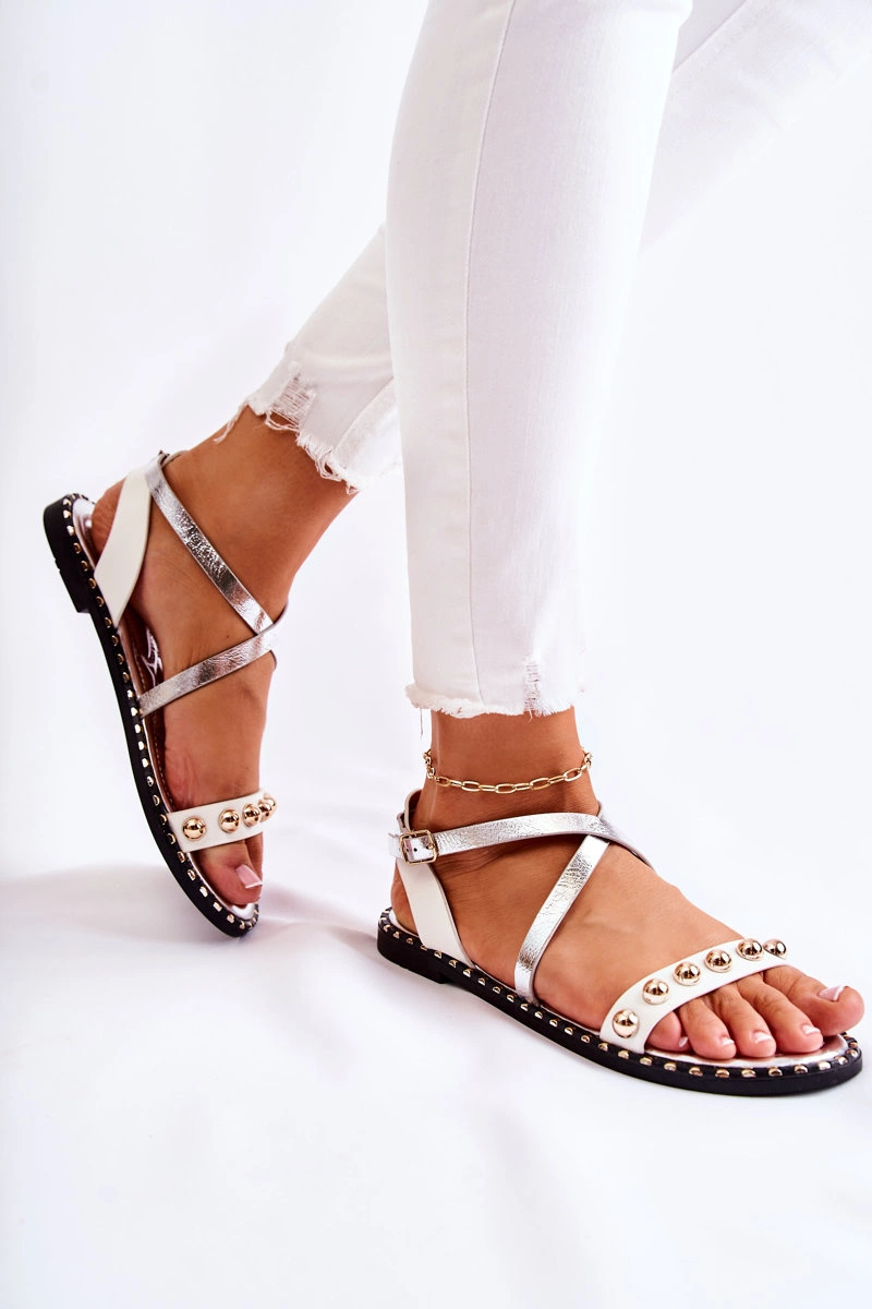 Modne Damskie Sandały Z Dżetami Biało-Srebrne Camalisa