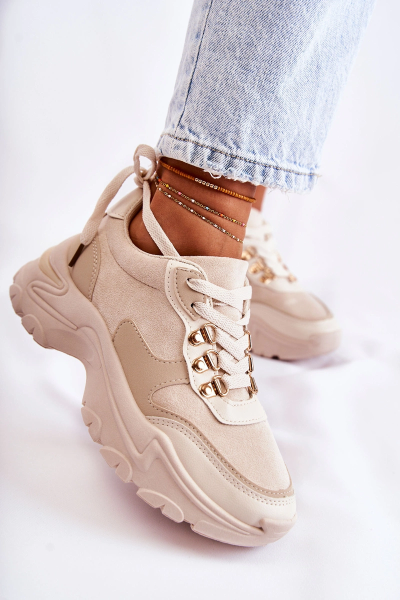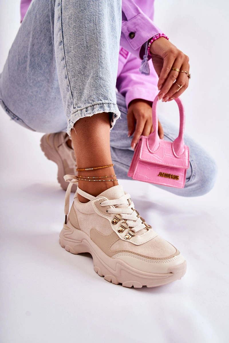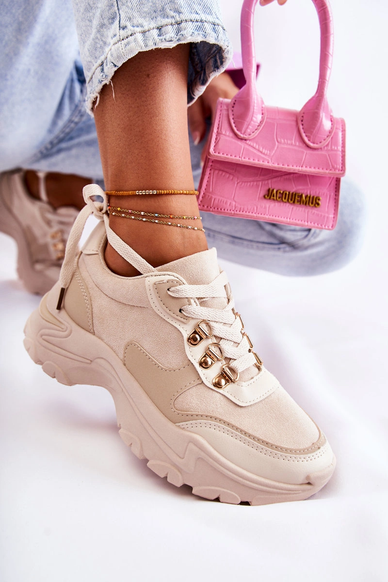 Modne sportowe buty damskie zostały wykonane z przyjemnego w dotyku eko zamszu oraz eko skóry. Cholewka do kostki. Model z wiązaniem, które pozwoli na odpowiednie dopasowanie obuwia do tęgości nogi. Buty osadzone na masywnym, płaskim obcasie oraz platformie. Sneakersy są wygodne w użytkowaniu, dzięki materiałowej wkładce, która jest dodatkowo wyciągana. Model z zaokrąglonym noskiem. Przy wyborze rozmiaru prosimy kierować się tabelą rozmiarów.