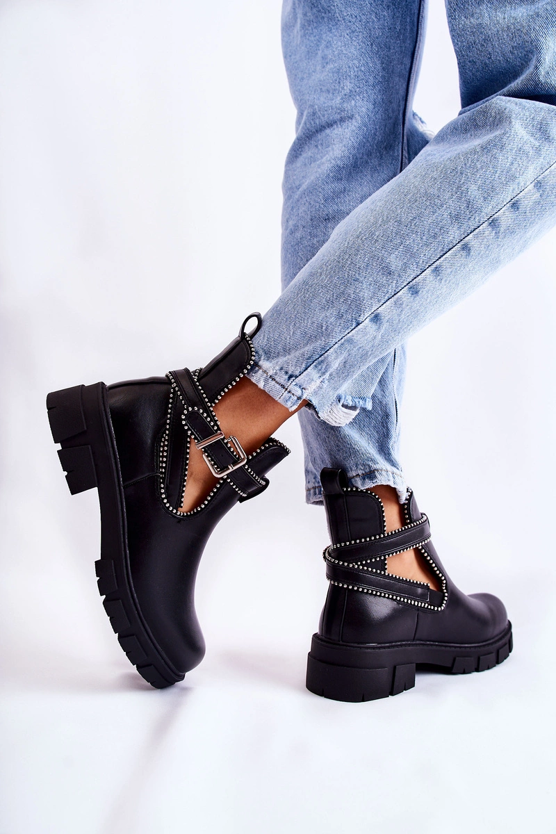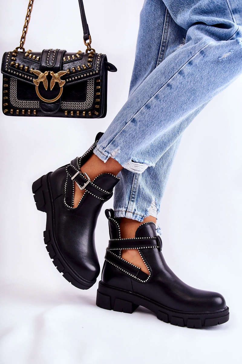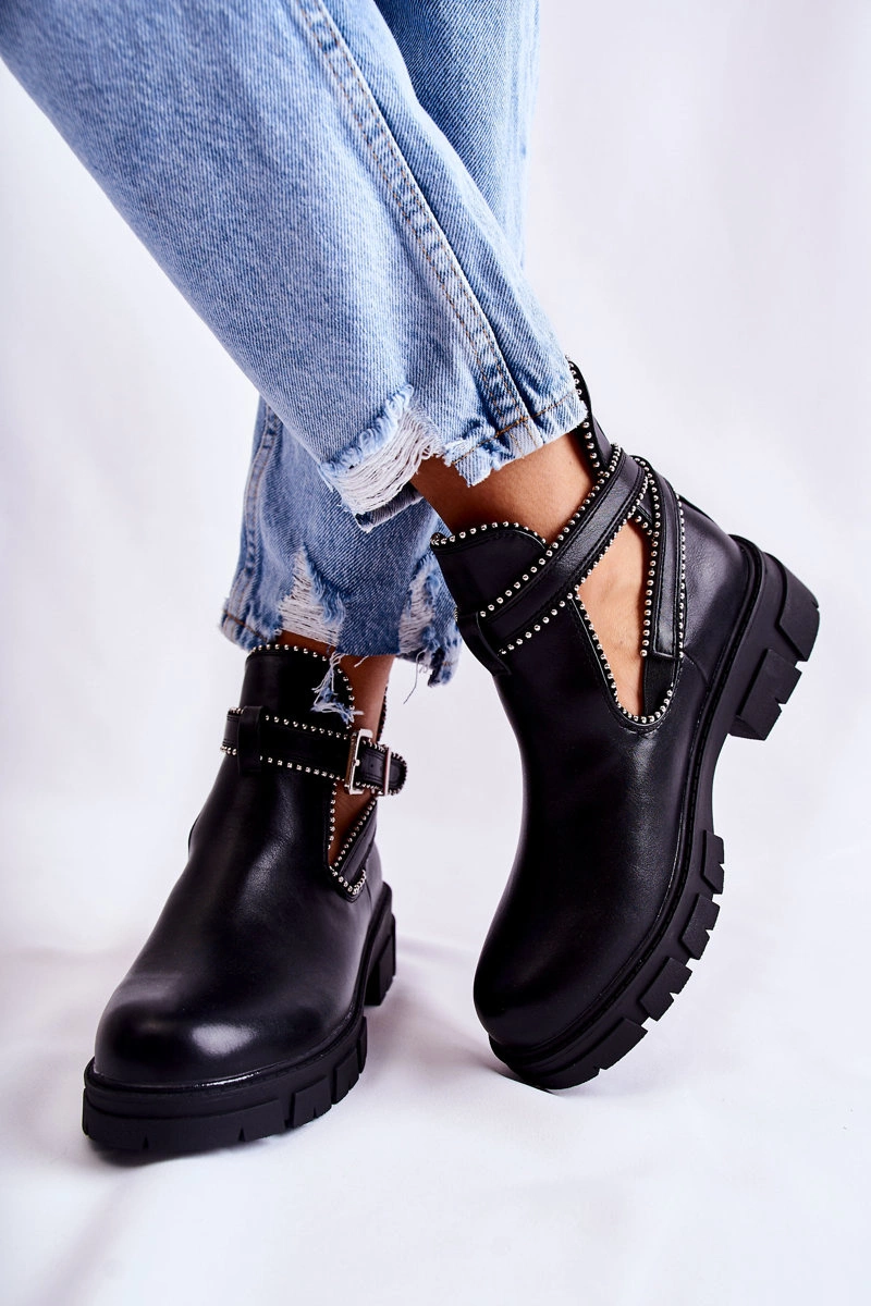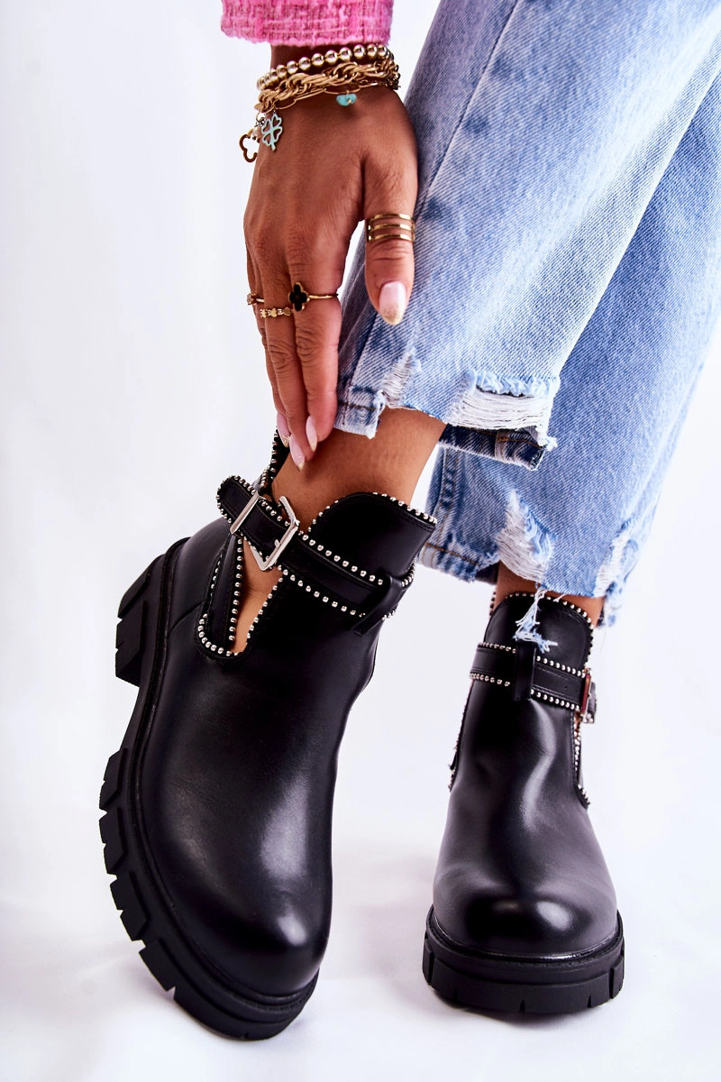 Damskie botki zostały wykonane z wierzchu z eko skóry. Na cholewce znajdują się paski z ozdobami w postaci ćwieków. Dodatkowo do jednego z pasków została przymocowana gumka. Model ten jest zapinany na regulowany pasek ze sprzączką. Wnętrze botków jest pokryte miękkim materiałem, natomiast wkładka jest wykonana z eko skóry. Delikatna platforma oraz płaski obcas zapewnią stabilność na każdym kroku. Przy wyborze rozmiaru prosimy sugerować się tabelą rozmiarów.