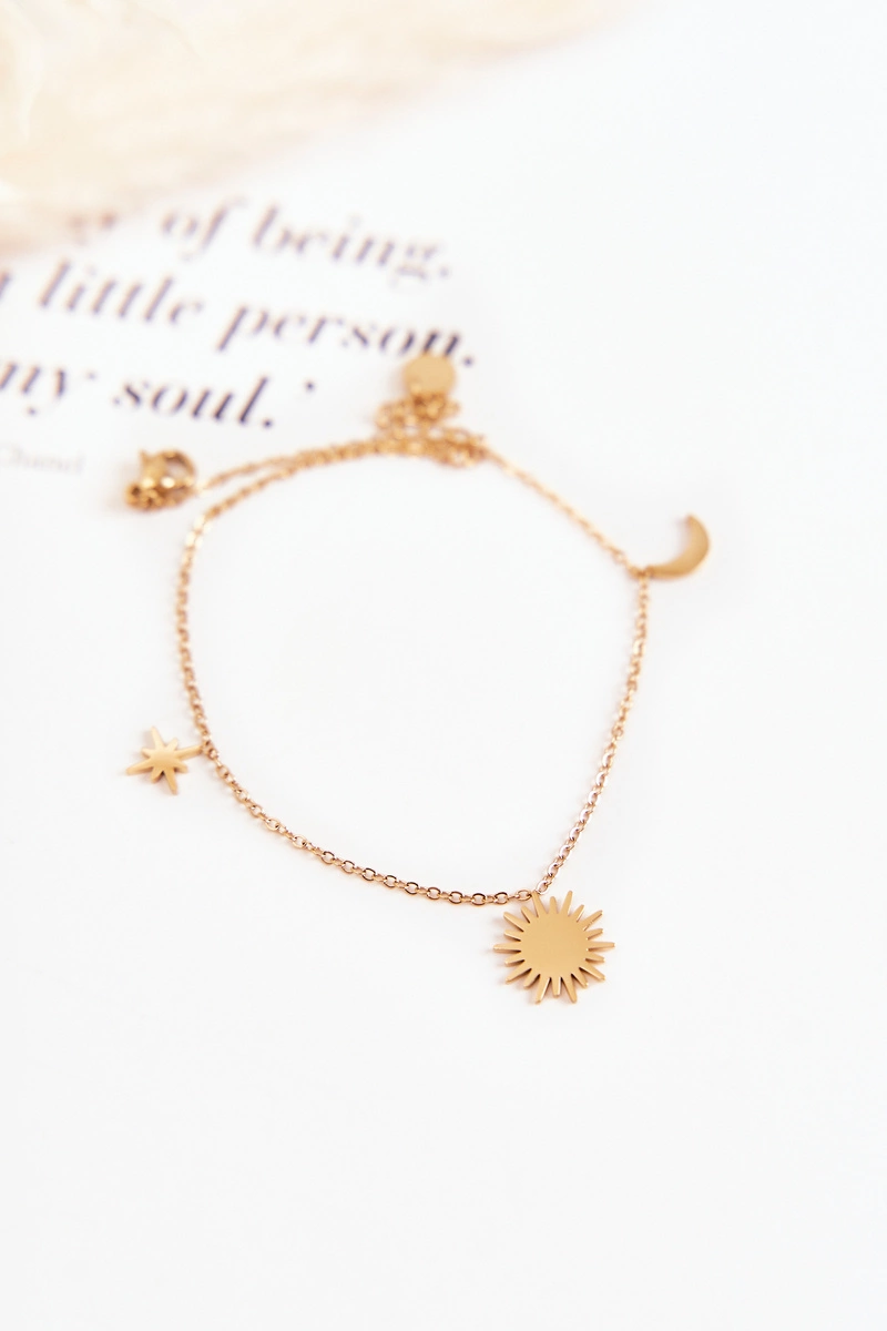 Wyjątkowa bransoletka na nogę na cienkim łańcuszku została wykonana ze stali nierdzewnej. Posiada możliwość regulacji długości. Na bransoletce znajdują się ozdobne elementy w postaci gwiazdy, słońca i księżyca. Taki rodzaj biżuterii jest świetnym dodatkiem do stylizacji nie tylko tych codziennych, ale i tych bardziej eleganckich.