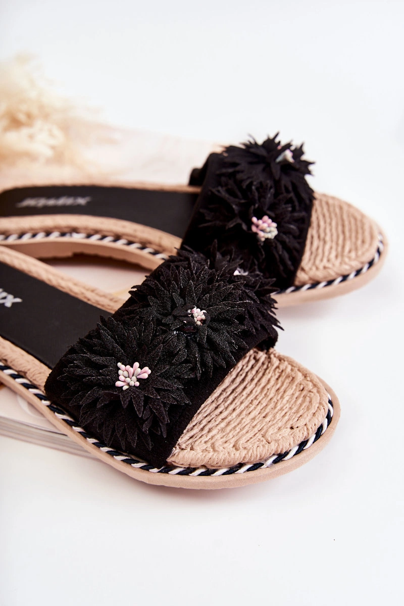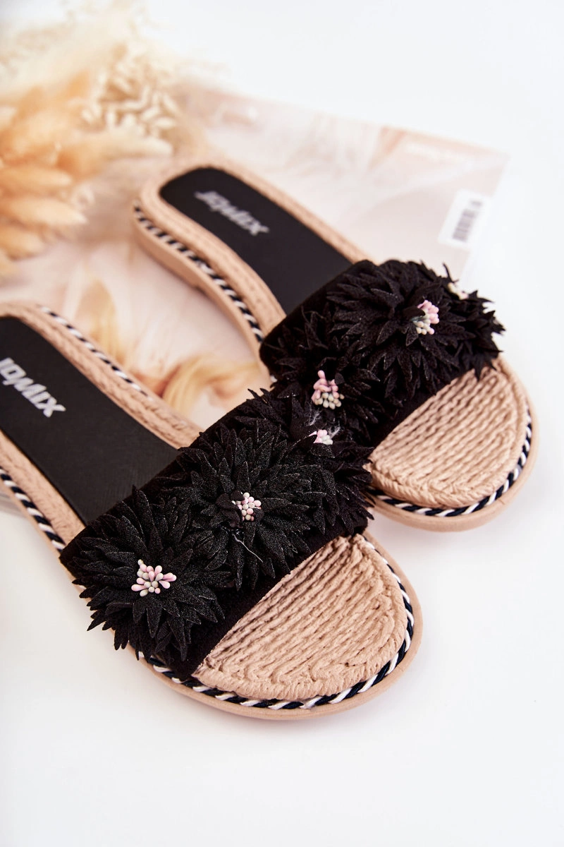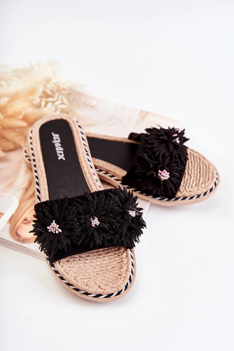 Damskie Klapki Z Materiałowymi Kwiatami Czarne Susana