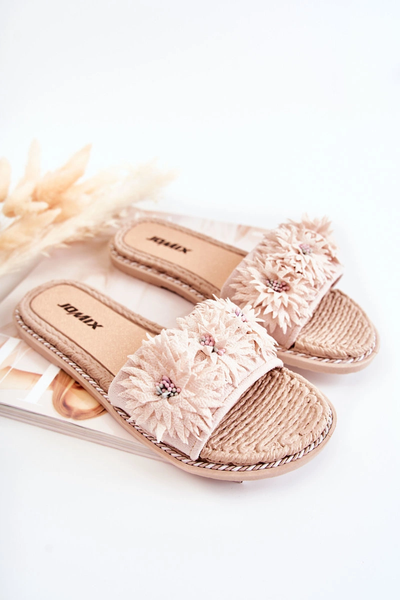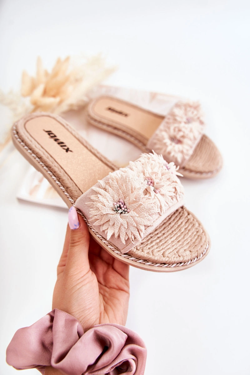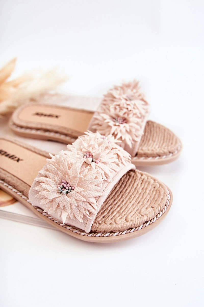 Damskie Klapki Z Materiałowymi Kwiatami Beżowe Susana