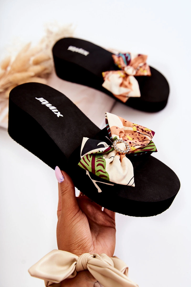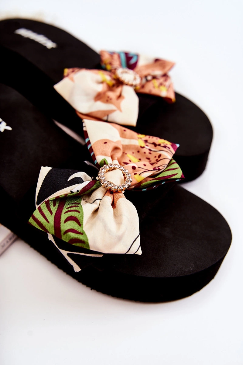 Klasyczne klapki damskie osadzone na koturnie oraz platformie. Pasek wraz z kokardą wykonane z materiału tekstylnego. Podeszwa wraz z koturnem zostały wykonane z piankowego tworzywa. Fason, który na pewno spodoba się niejednej miłośniczce modowych inspiracji! Kokarda została przyozdobiona elementem z tworzywa sztucznego z dżetami imitującymi cyrkonie. Przy wyborze rozmiaru prosimy sugerować się tabelą rozmiarów.