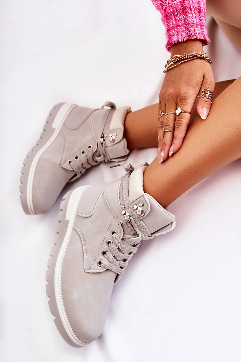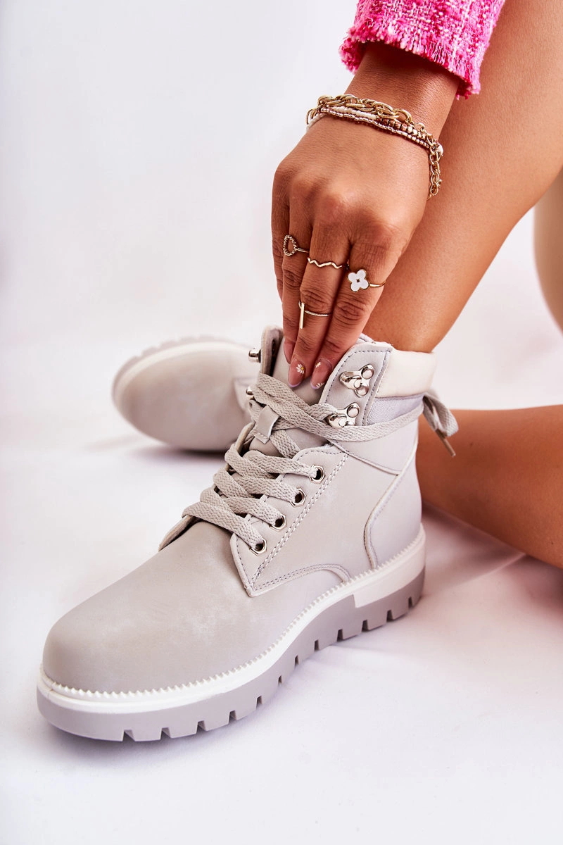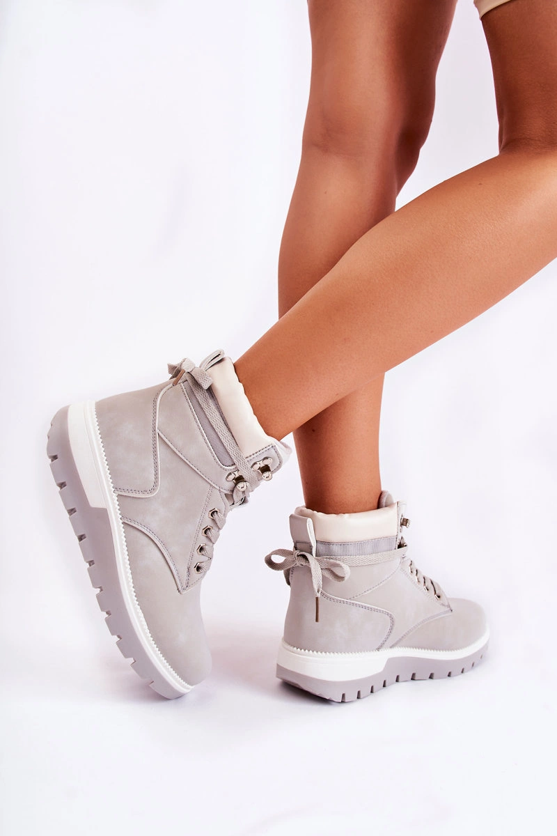 Botki damskie zostały wykonane z eko skóry. Model osadzony jest na platformie z charakterystycznymi żłobieniami. Posiadają zaokrąglony nosek. Cholewka zakrywająca kostkę z małą pętelką z tyłu ułatwiającą zakładanie obuwia. Wkładka oraz wyściółka ocieplone kocem obuwniczym. Klasyczne wiązanie na płaskie sznurowadła pozwoli na odpowiednie dopasowanie obuwia do tęgości nogi. Przy wyborze rozmiaru prosimy sugerować się tabelą rozmiarów.