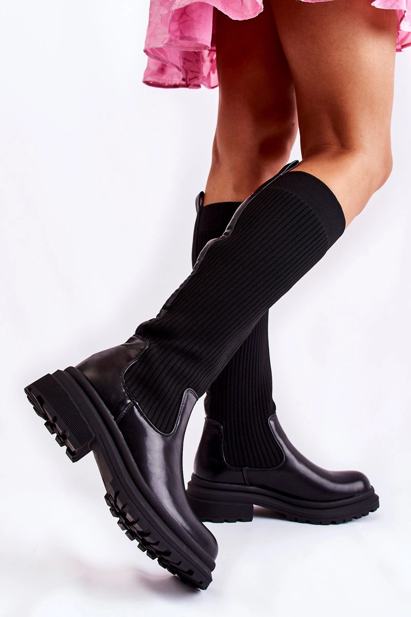 Prążkowane Damskie Kozaki Na Płaskim Obcasie Czarne Allys