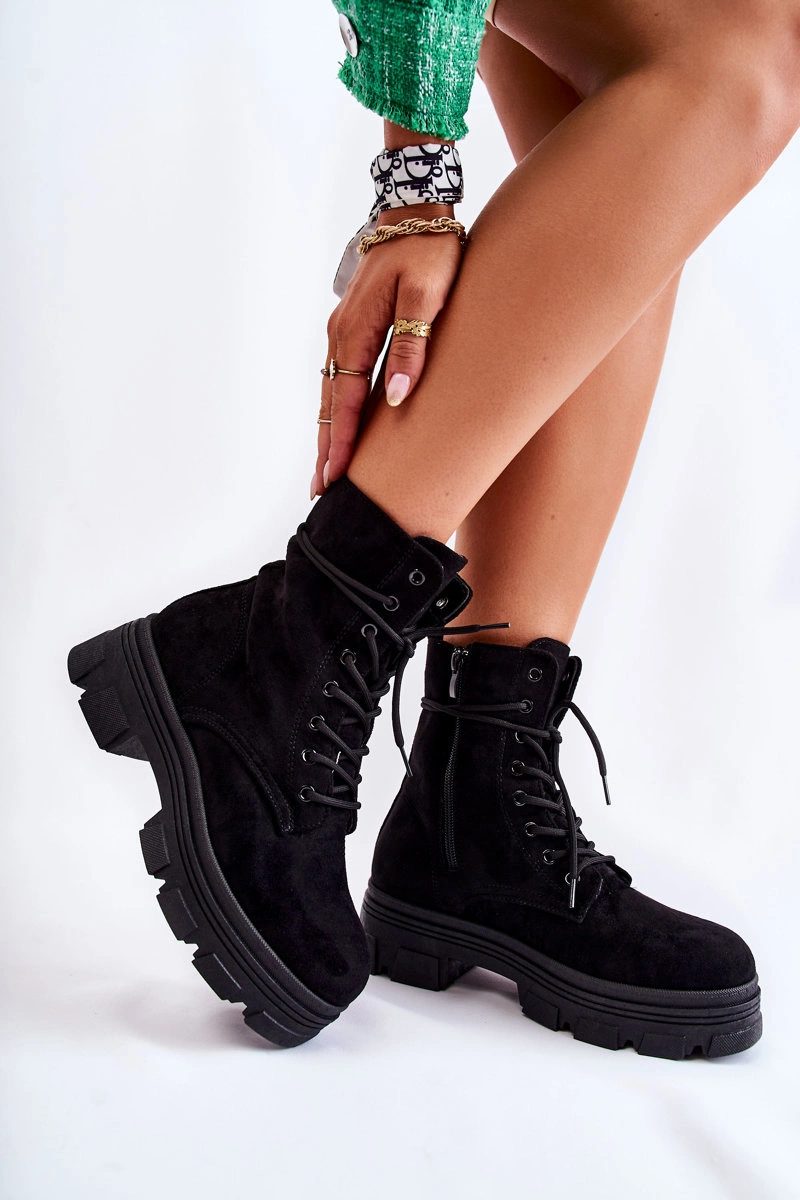 Damskie botki z wyższą cholewką za kostkę zostały wykonane z przyjemnego w dotyku eko zamszu. Model ten posiada wiązanie oraz suwak. Osadzone na platformie oraz płaskim obcasie. Podeszwa jest wykonana z gumowego tworzywa i jest także antypoślizgowa. Botki te posiadają w środku ocieplenie w postaci miłego w dotyku futerka. Zapiętek usztywniany pozwoli na odpowiednią stabilizację stopy. Przy wyborze rozmiaru prosimy sugerować się tabelą rozmiarów.