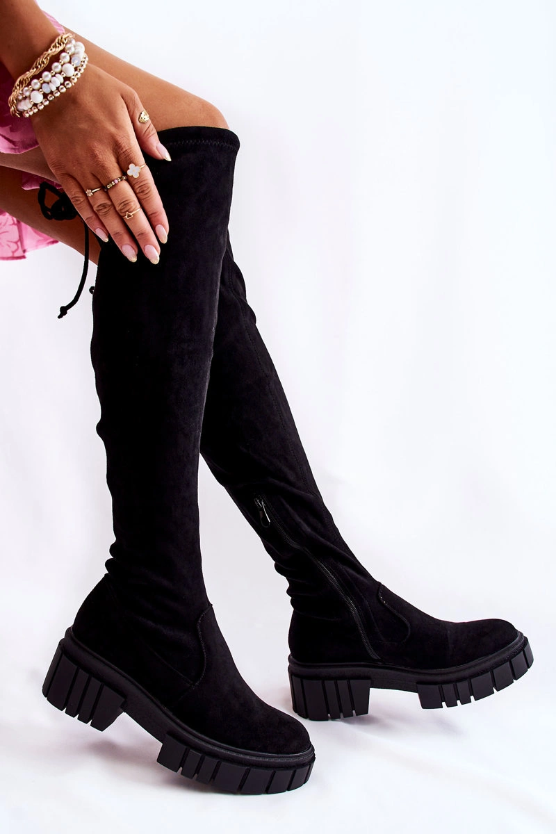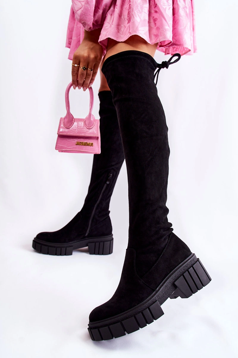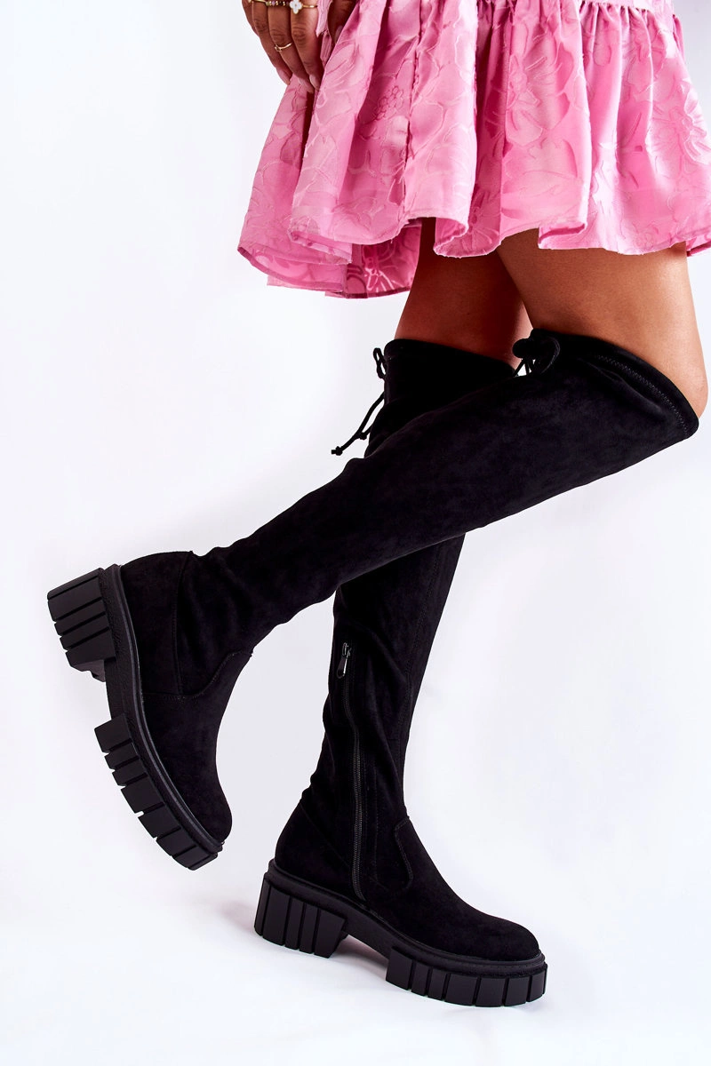 Piękne kozaki damskie z cholewką za kolano. Model został wykonany z przyjemnego w dotyku eko zamszu. Zapinane na suwak z boku cholewki. Dodatkowo kozaki posiadają wiązanie, dzięki któremu można je odpowiednio dopasować. Model osadzony na masywnym płaskim obcasie i platformie. Kozaki posiadają ocieplenie w postaci koca obuwniczego tylko na wysokości stopy. Zapiętek usztywniany. Przy wyborze rozmiaru prosimy kierować tabelą rozmiarów.