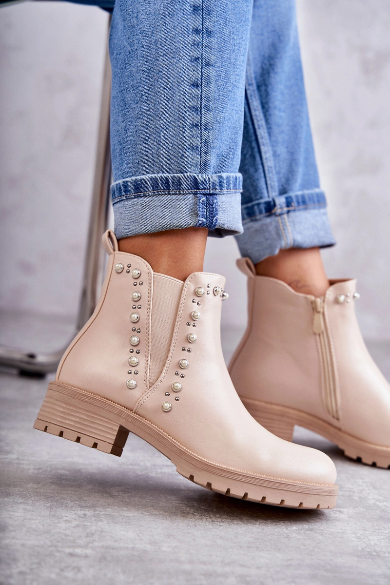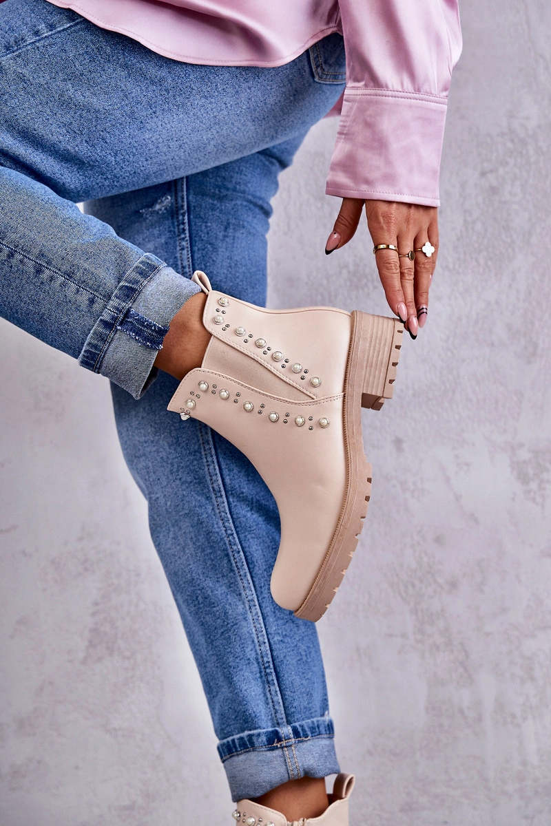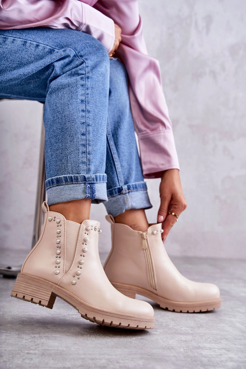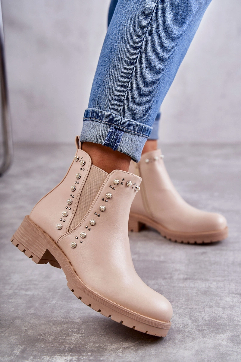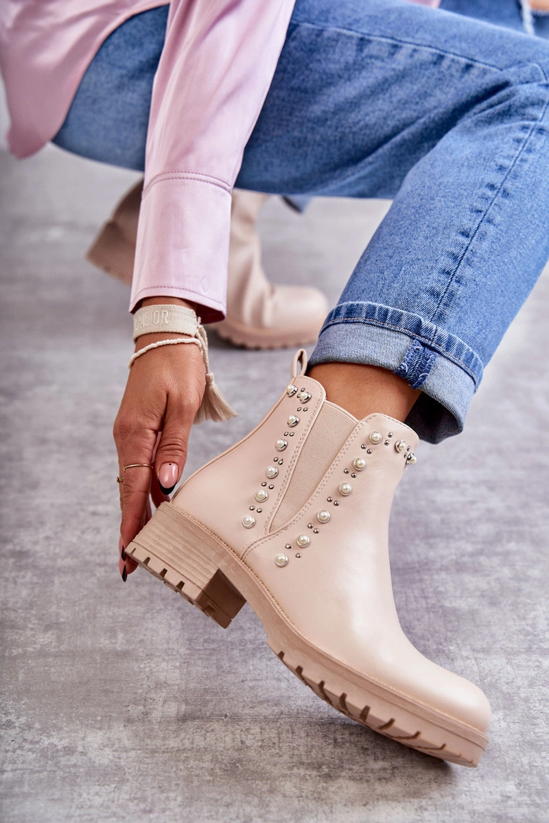 Wsuwane botki damskie zostały osadzone na płaskim obcasie i delikatnej platformie. Wykonane z eko skóry z ozdobami na cholewce w postaci ćwieków i perełek. Zapinane na suwak. Botki te posiadają ocieplenie w postaci koca obuwniczego. Model klasyczny, idealny do wielu stylizacji. Koniecznie musisz je mieć! Przy wyborze rozmiaru prosimy sugerować się tabelą rozmiarów.