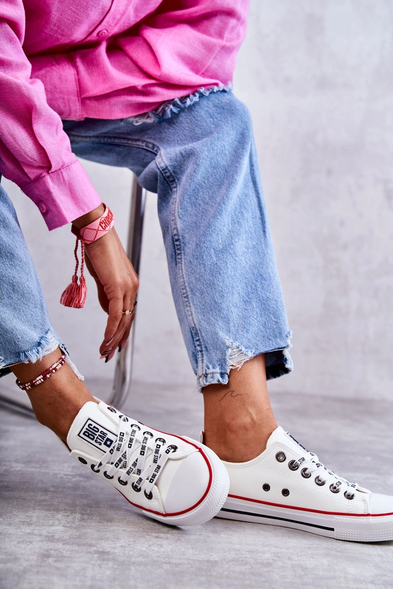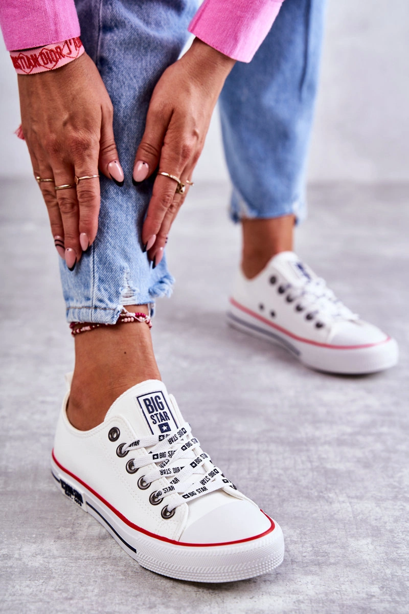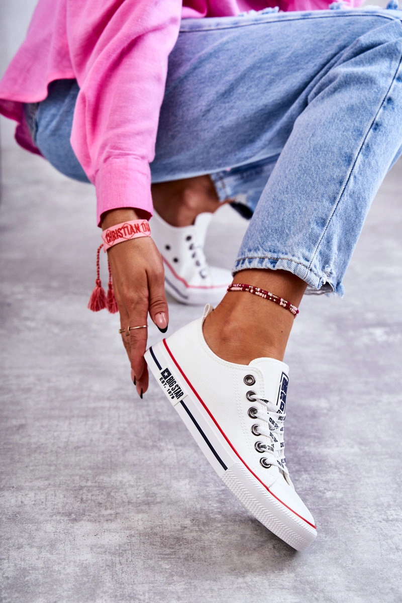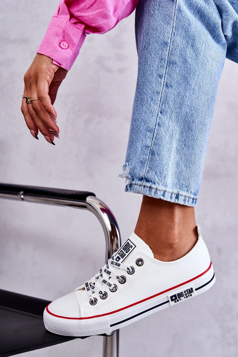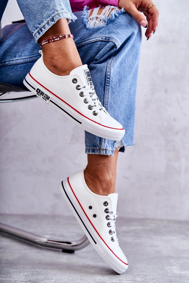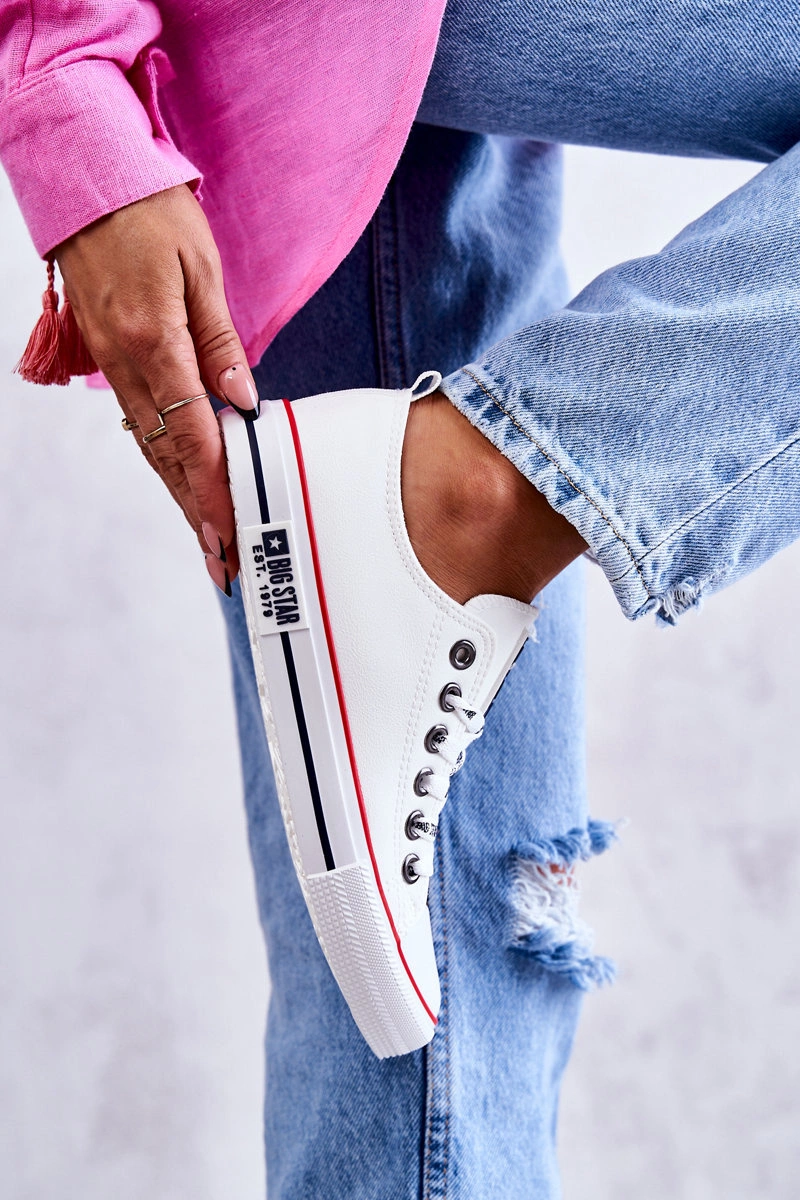 Ponadczasowe trampki damskie marki Big Star zostały wykonane z eko skóry. Posiadają gumowy, wzmacniany nosek. Model charakteryzuje się logowanymi sznurowadłami. Podeszwa wraz z platformą wykonane z gumowego tworzywa, dzięki którym model ten jest antypoślizgowy. Wkładka materiałowa. Klasyczne trampki z pewnością świetnie będą prezentować się w wielu stylizacjach. Przy wyborze rozmiaru prosimy sugerować się tabelą rozmiarów.