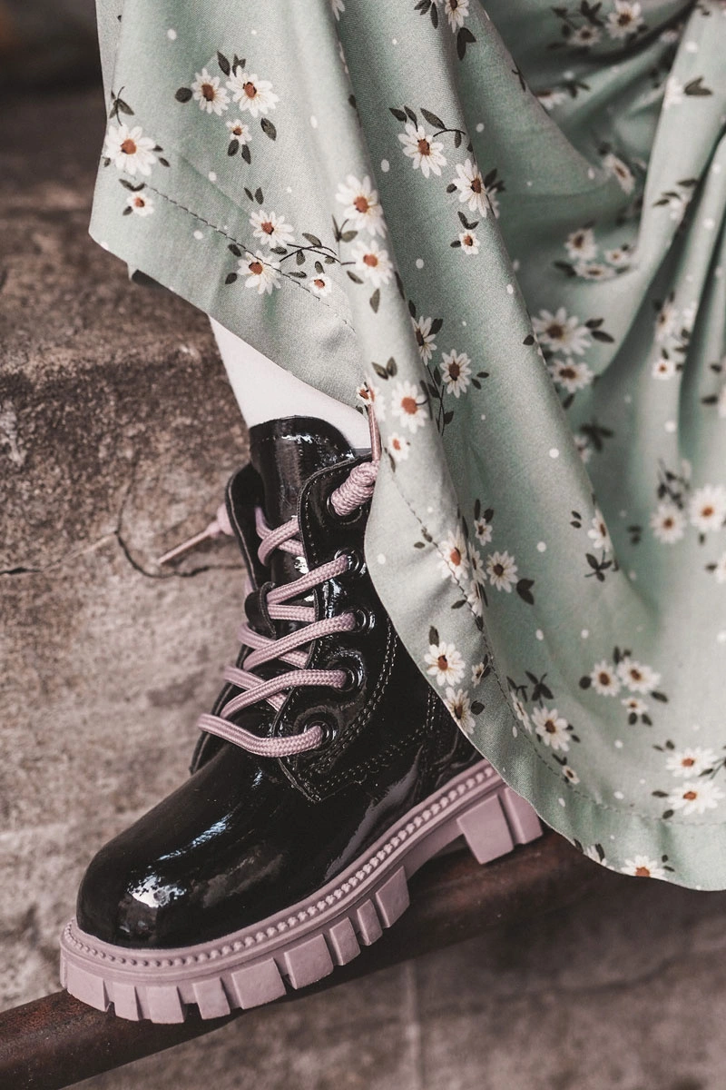 Śliczne botki w stylu traperów to idealne obuwie na chłodniejsze dni! Cholewka zapinana na suwak z dodatkowym sznurowaniem z przodu. Zapiętek oraz nosek są usztywniane. W środku botki są ocieplane miłym w dotyku kocem obuwniczym. Osadzone na płaskim obcasie z bieżnikiem. Model ten posiada bootstrapa, czyli pętelkę ułatwiającą zakładanie i ściąganie obuwia. Przy wyborze rozmiaru prosimy kierować tabelą rozmiarów.