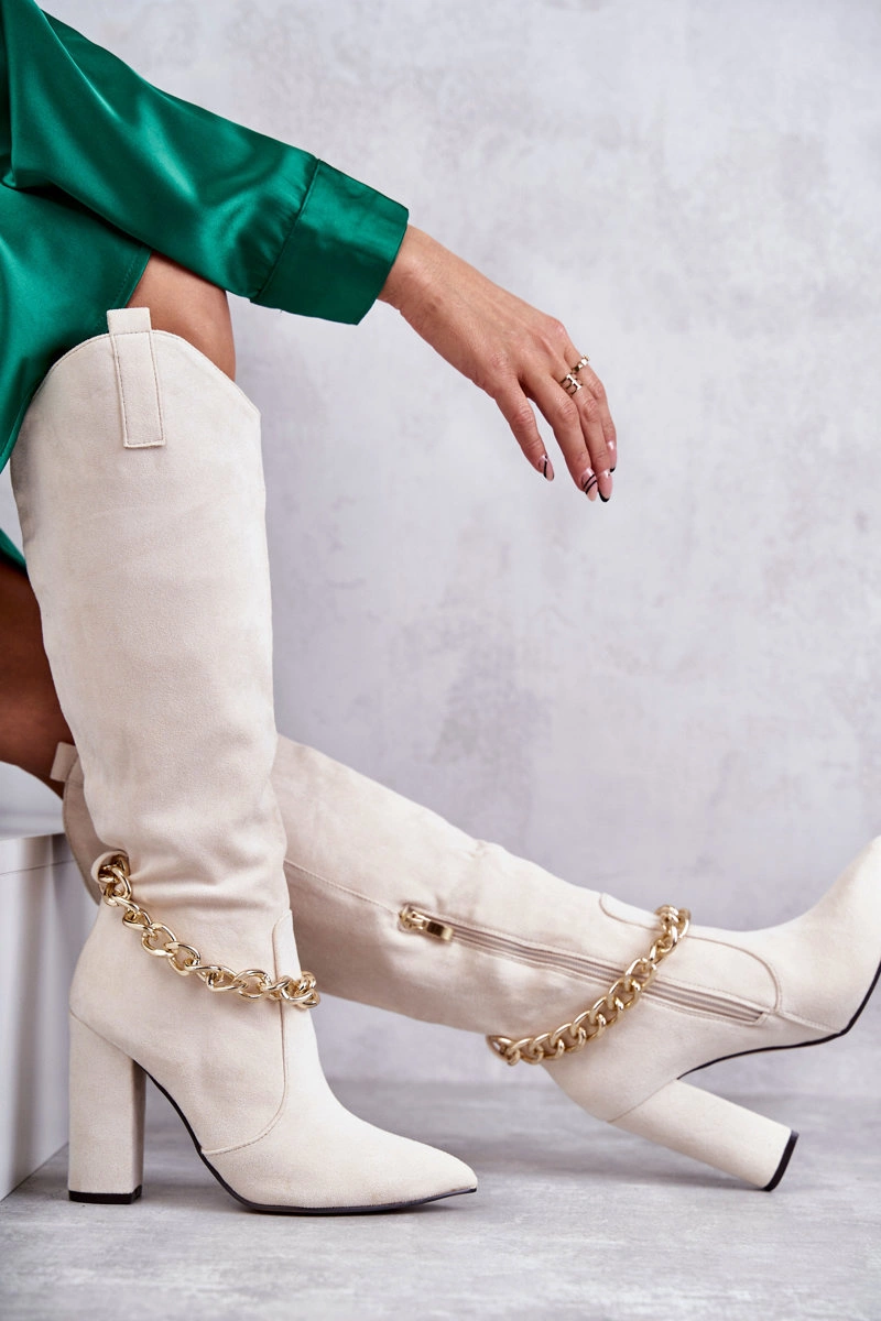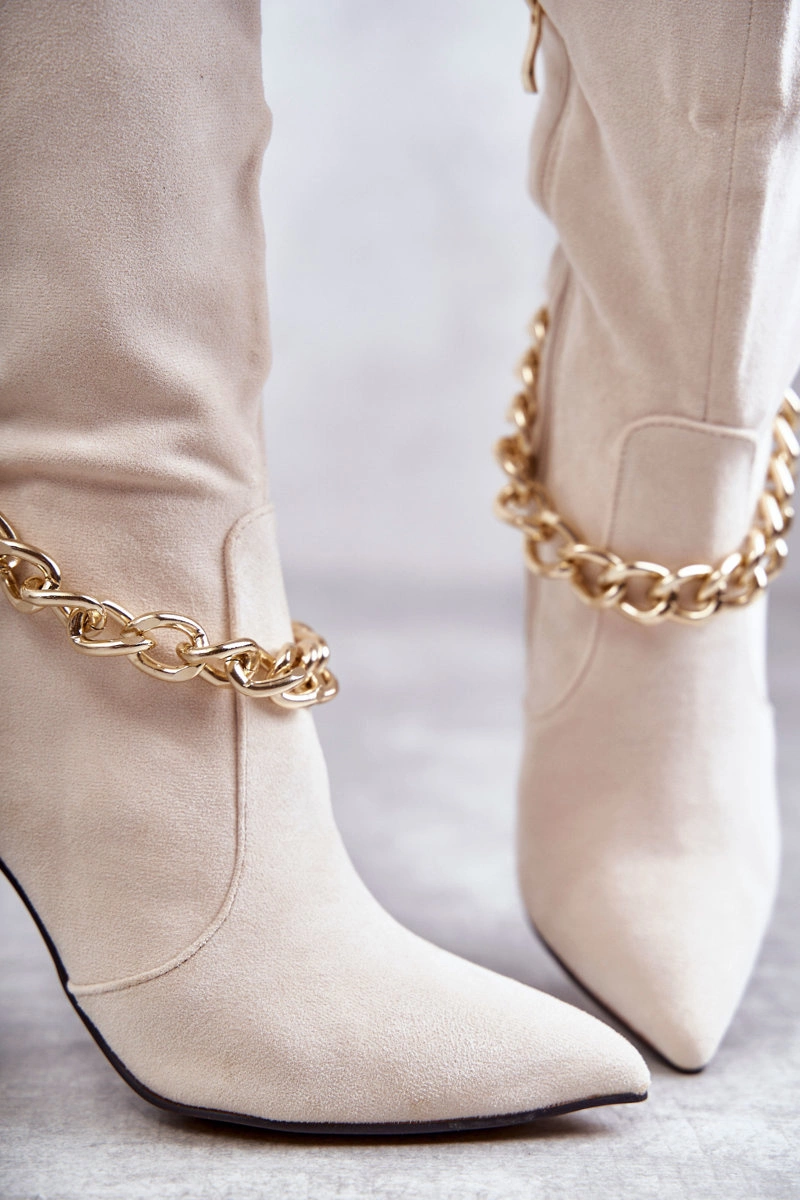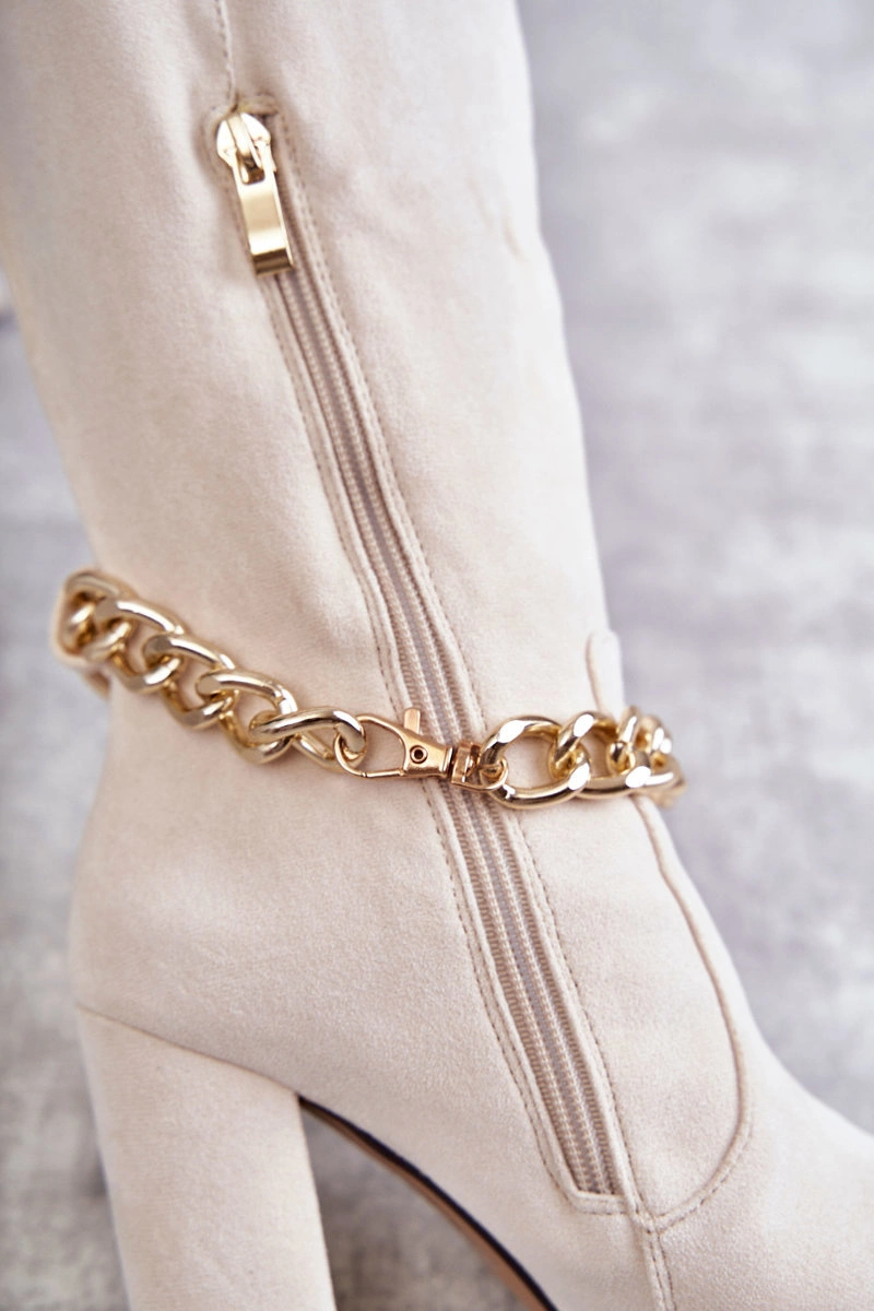 Damskie Zamszowe Ocieplane Kozaki Z Łańcuchem Jasnobeżowe Jasmin