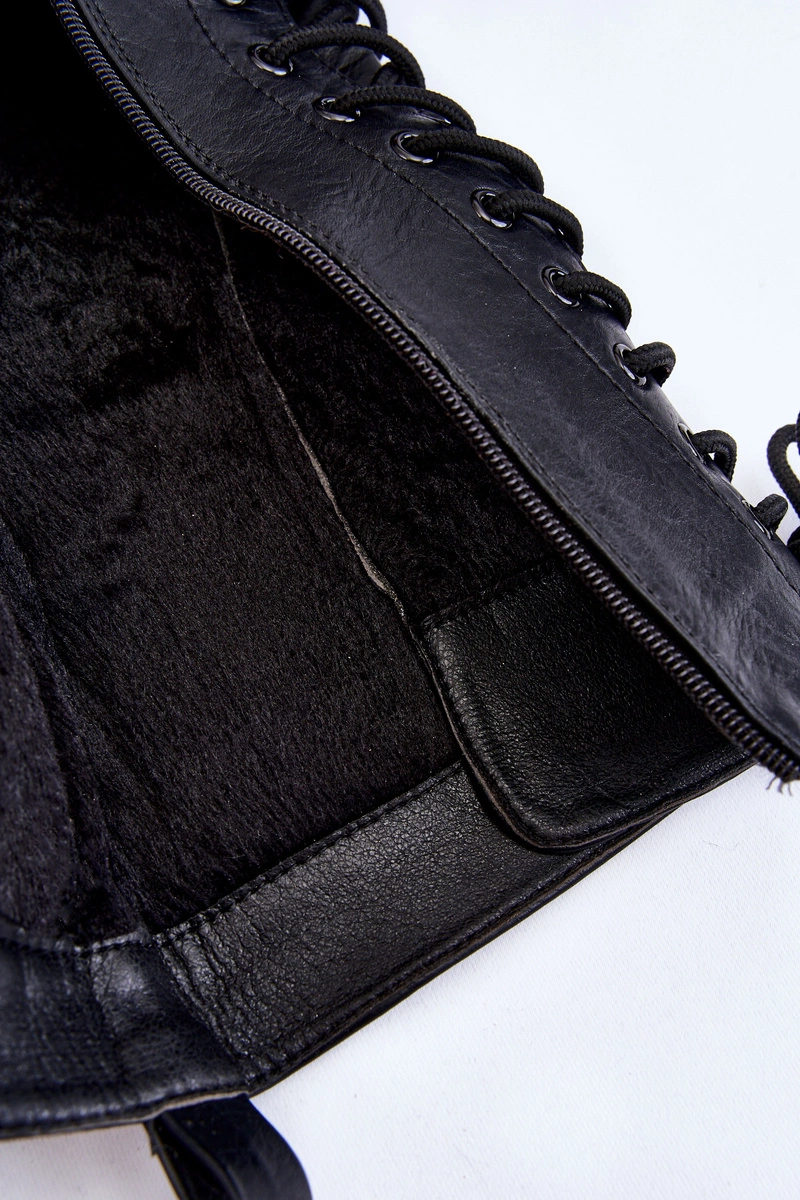 Damskie kozaki — glany posiadają sznurowanie oraz suwak na całości cholewki. Fason do połowy łydki z ozdobnym paskiem z klamrą i nerką, który można zdjąć. Kozaki zostały wykonane z eko skóry. Osadzone na masywnej platformie. Zapiętek jest usztywniany. Kozaki posiadają ocieplenie w postaci krótkiego futerka. Przy wyborze rozmiaru prosimy kierować tabelą rozmiarów.