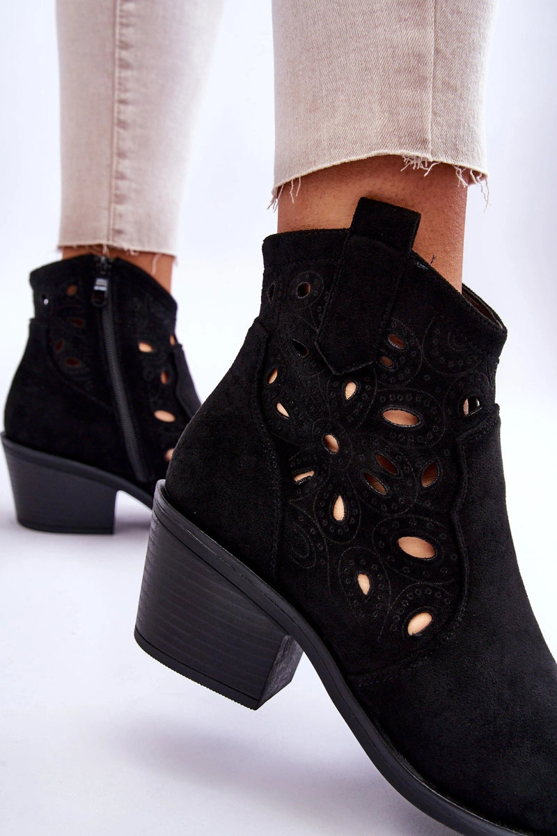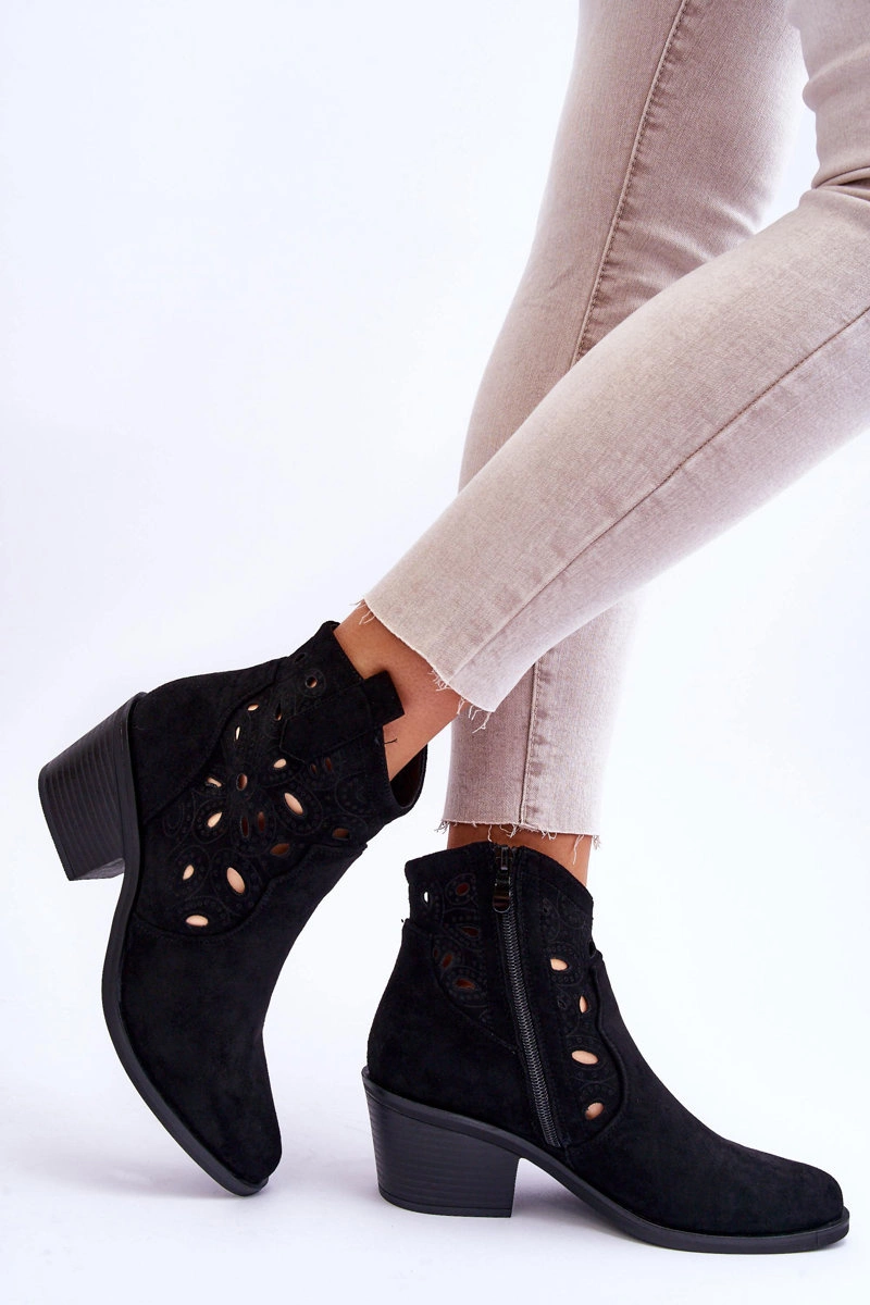 Kowbojki na masywnym słupku zapewniają stabilność podczas użytkowania. Zapinane z boku cholewki na zamek błyskawiczny. Posiadają usztywniany zapiętek. Wykonane z eko zamszu w modny, ażurowy wzorek. Botki w stylu kowbojek będą świetnym uzupełnieniem wielu stylizacji. Możesz nosić je m.in.: do szmizjerek, zwiewnych spódnic czy spodni jeansowych. Przy wyborze rozmiaru prosimy sugerować się tabelą rozmiarów.