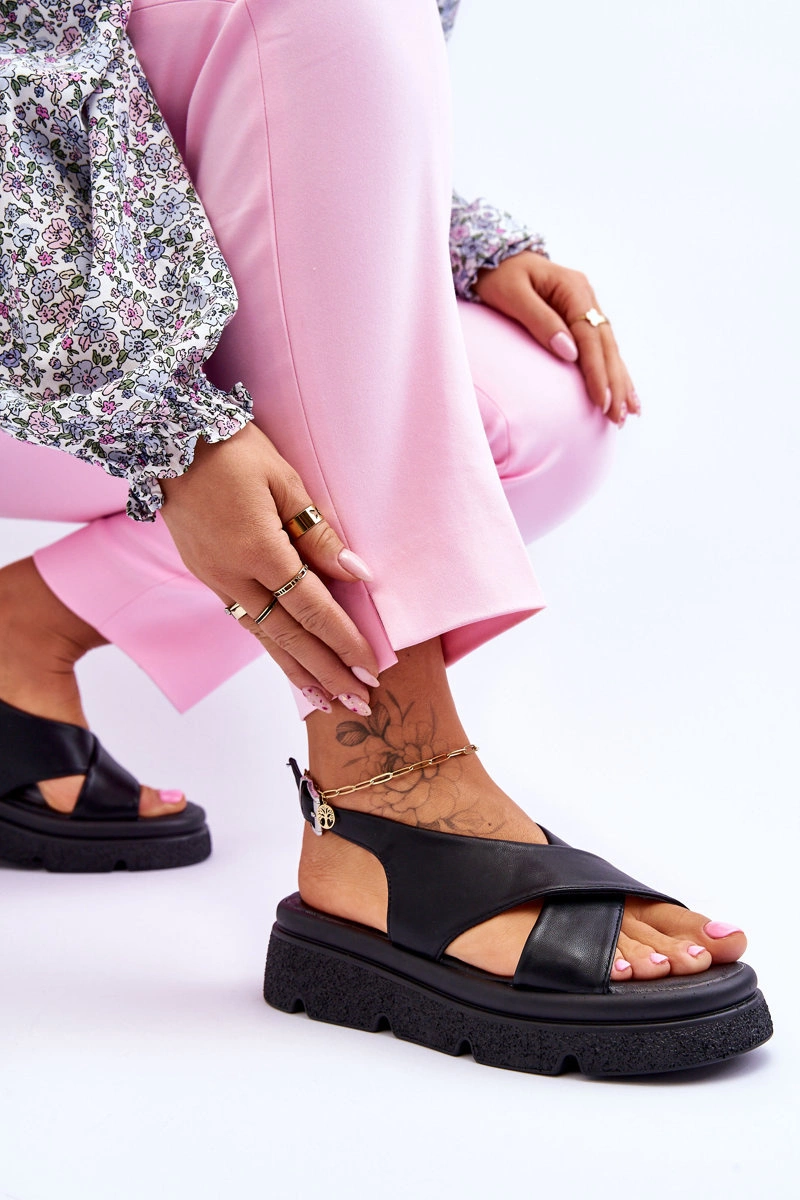 Modne sandały zostały wykonane z wysokiej jakości eko skóry. Posiadają zapinanie wokół kostki na klamrę z regulowanym paskiem. Wkładka została wykonana z miękkiej eko skóry. Sandały posiadają odkryte palce i piętę. Osadzone na masywnej platformie z tworzywa sztucznego. Te sandałki to idealny wybór na upalne dni! Przy wyborze rozmiaru prosimy sugerować się tabelą rozmiarów.