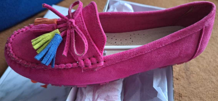 Piękne mokasyny, kolor różowy tak jak na filmie i zdjęciach. Niestety musiałam zamienić rozmiar 38 i zamówić ponownie 39 co znacznie podwyższyło cenę. Buty są naprawdę szczupłe. Brakuje mi długości wkładki przy ofercie.