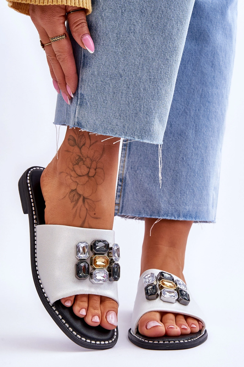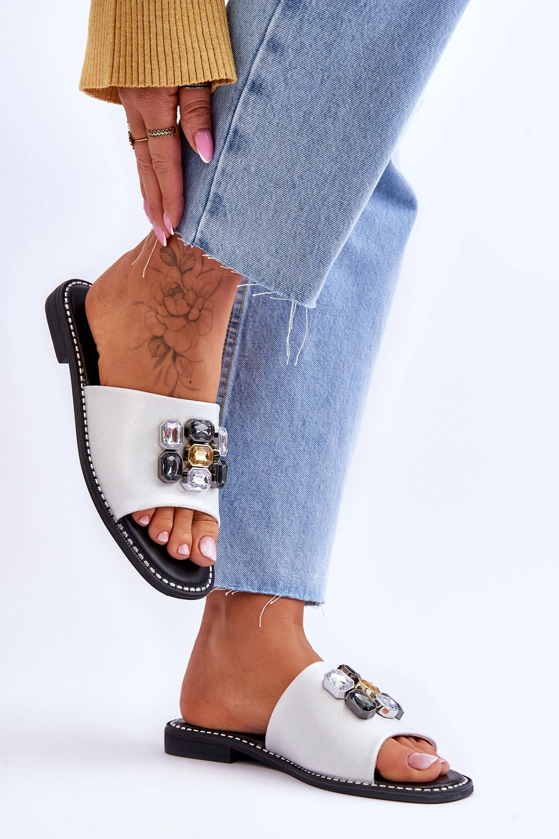 Damskie Klapki Z Kamieniami S.Barski KV-2775-31 Biało-Srebrne