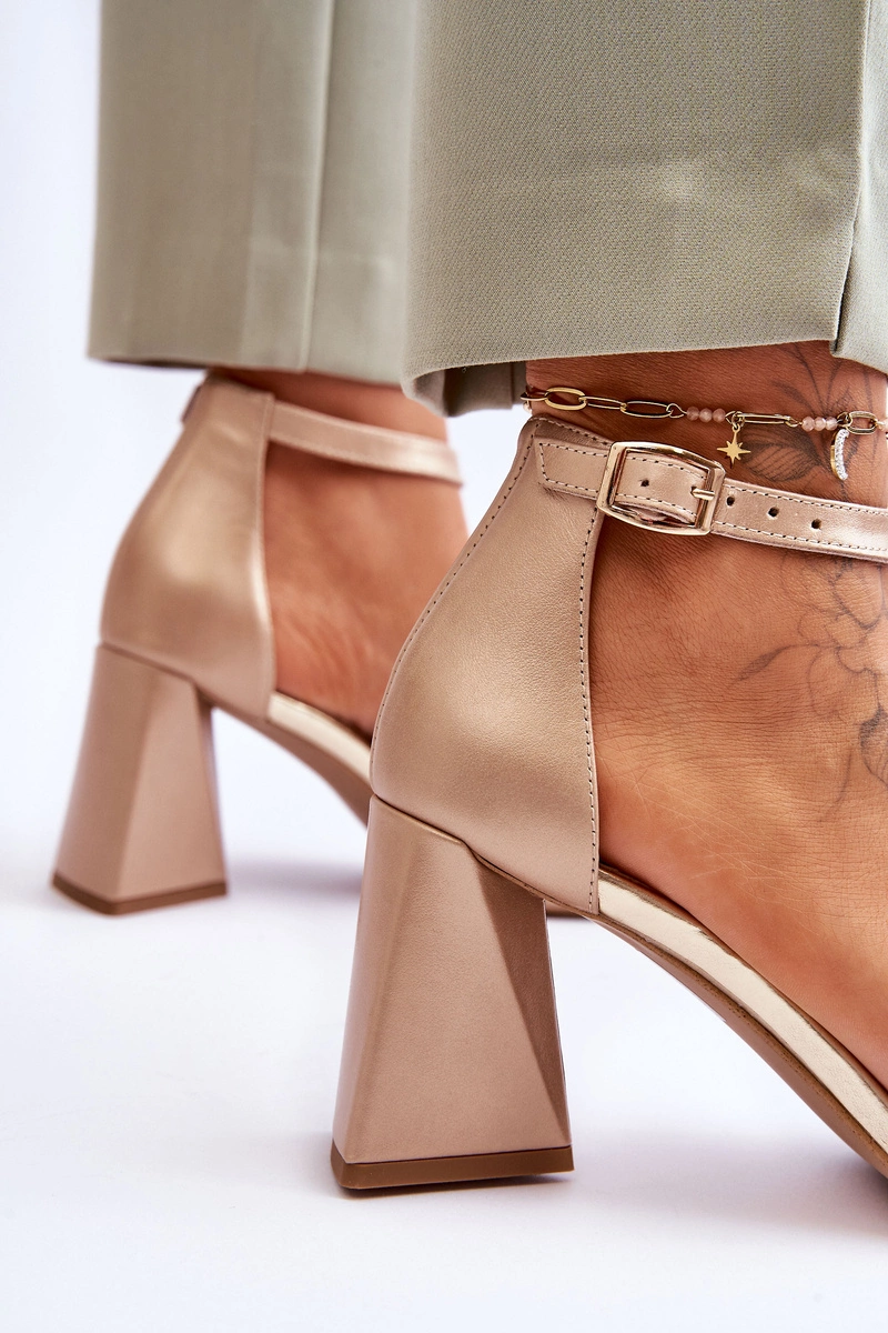 Eleganckie sandały zostały wykonane z naturalnej skóry. Posiadają ozdobę na przednim pasku wykonaną z tworzywa sztucznego. Miękka wkładka została wykonana z naturalnej skóry i zapewni komfort podczas użytkowania. Model ten jest zapinany wokół kostki na sprzączkę i jest regulowany. Sandałki osadzono na trójkątnym obcasie, który jest stabilny i wygodny. Buty świetnie sprawdzą się na spotkania biznesowe czy na różnego rodzaju uroczystości. Przy wyborze rozmiaru prosimy sugerować się tabelą rozmiarów.