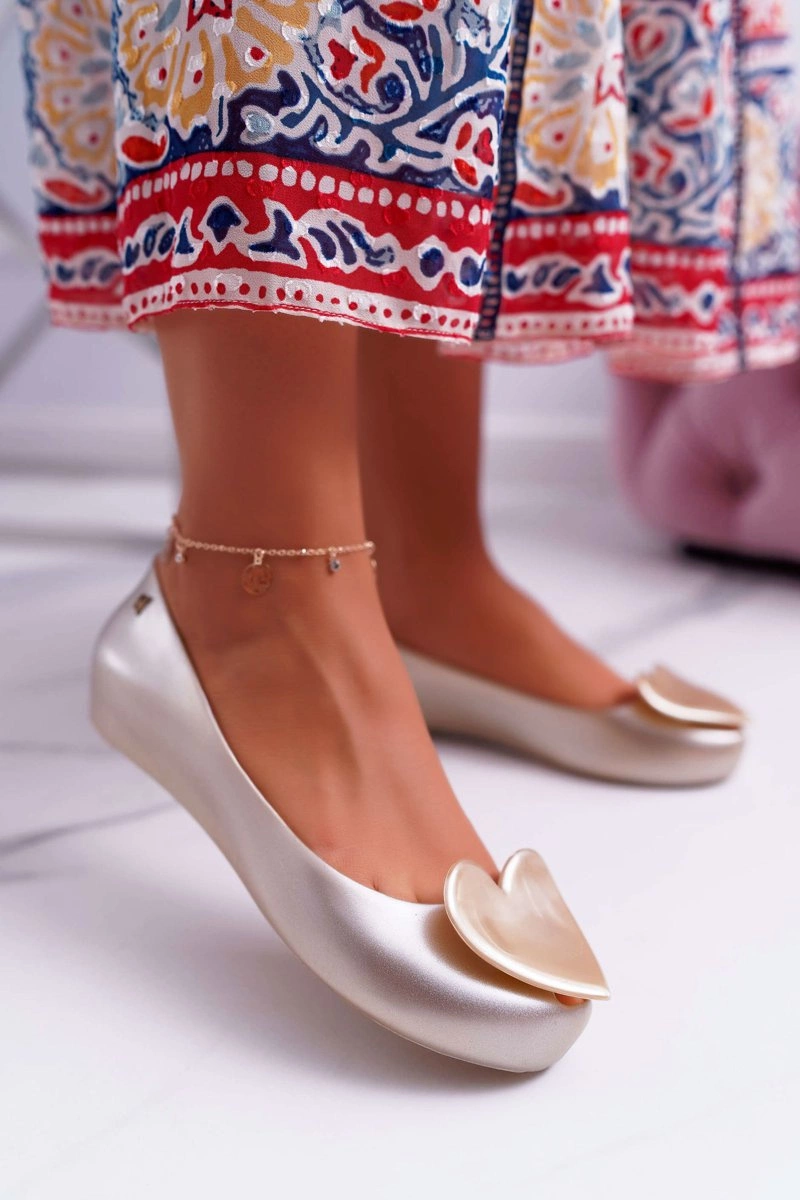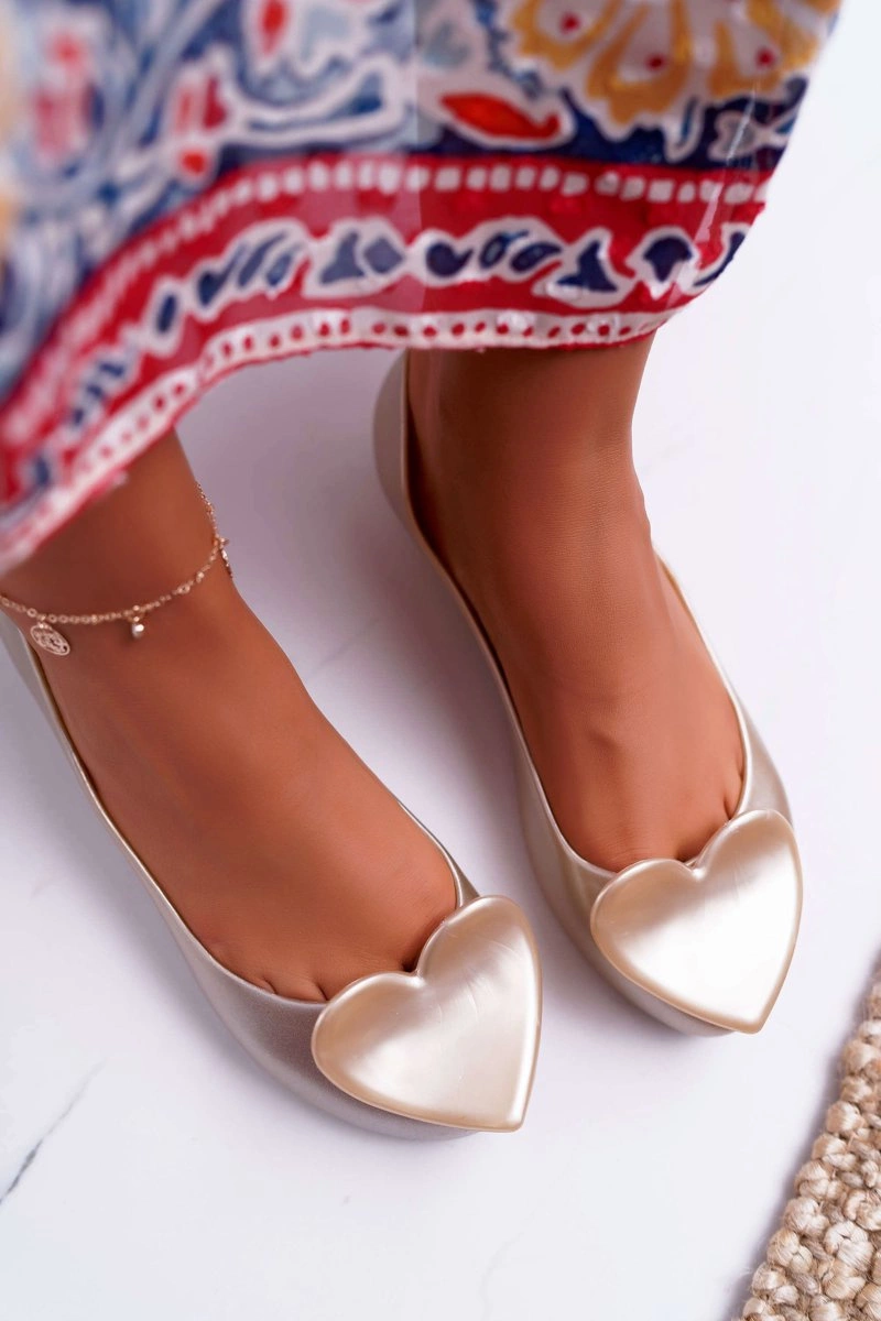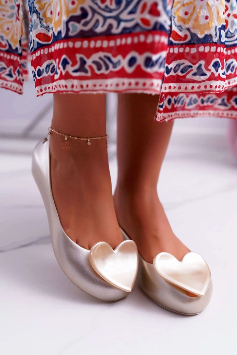 Poczuj lato już teraz i spraw sobie te wspaniałe gumowe balerinki od renomowanej firmy! Zdobienie w postaci serca nadaje im dziewczęcego uroku i pozwala na wiele wspaniałych stylizacji. Idealne na ciepłe dni. Delikatna wkładka i odkryte palce w stylu peep toe to gwarancja komfortu! Dostępne w kilku kolorach.
