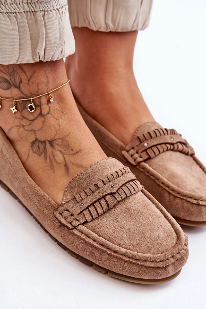 Idealne na wiele okazji klasyczne mokasyny damskie zostały wykonane z eko zamszu. Model ten posiada na przodzie ozdobny paseczek z ćwiekami. Mokasyny osadzono na niskiej platformie. Miękka wkładka z eko skóry zapewni komfort podczas użytkowania obuwia. Model ten posiada kwadratowy nosek. Przy wyborze rozmiaru prosimy sugerować się tabelą rozmiarów.
