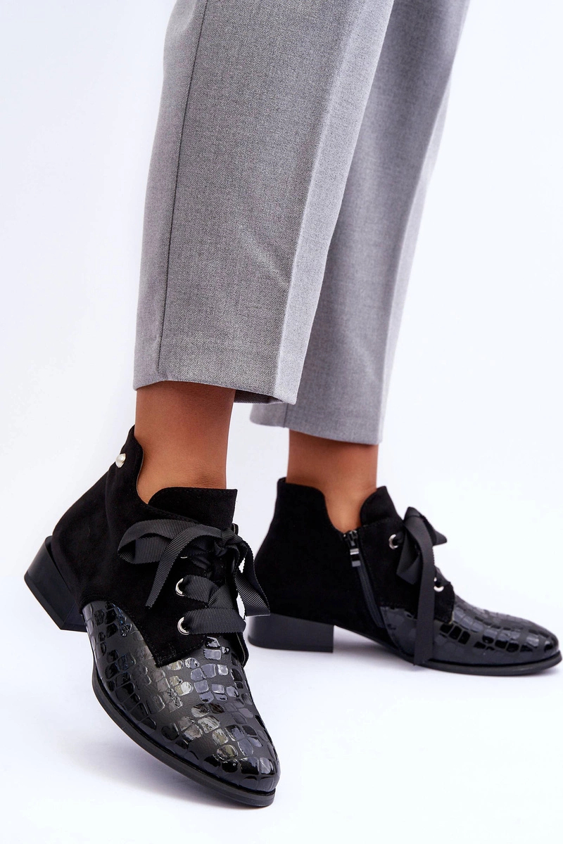 Damskie Półbuty Na Płaskim Obcasie Z Wiązaniem Czarne Meroni - Zamsz